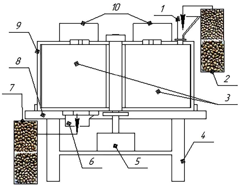 2. Fig. 1. The microwave unit: 1 — a loading section; 2 — reference soybeans; 3 — operating sections; 4 — struts; 5 — a motor; 6 — a discharge section; 7 — treated soybeans; 8 — a table; 9 — a body structure; 10 — magnetrons.