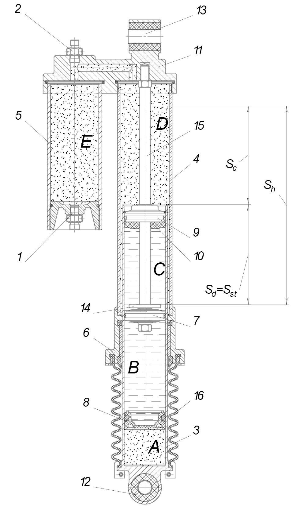 Fig. 1. Design parameters of the pneumohydraulic shock absorber with an additional pneumatic chamber according to the patent for utility model RU № 218675: A — a gas compensation cavity; B and C — lower and upper liquid cavities; D and E — a gas spring; Sh — total shock absorber stroke; Sd — rebound stroke; Sc and Sst — compression stroke and static deformation; 1 — a safety valve; 2 — an adjusting valve; 3 — a lower cylinder; 4 — an upper cylinder; 5 — an additional pneumatic chamber; 6 — a sealing sleeve; 7 — a hydraulic piston; 8 — a pneumatic piston; 9 — a guiding (separating) sleeve; 10 — a damping gasket; 11 — a top cover of the shock absorber; 12, 13 — lugs for shock absorber mounting; 14 — a retaining ring; 15 — a rod; 16 — a protective casing.