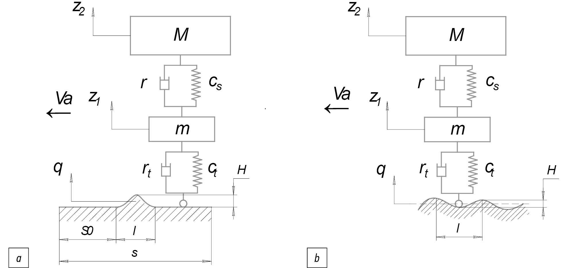 To study the oscillatory processes of a vehicle, an oscillatory system is used, consisting of several masses connected to each other by elastic-damping bonds [33], allowing for the analysis of the vertical dynamics of oscillations. Specifically, we consider a two-mass oscillatory system (Fig. 2) to evaluate the behavior of the masses in two situations: driving over a single irregularity (unsteady oscillations, Fig. 2a) and facing the most unfavorable conditions, such as driving over sinusoidal irregularities (Fig. 2b), i.e., under steady (forced) oscillations.
