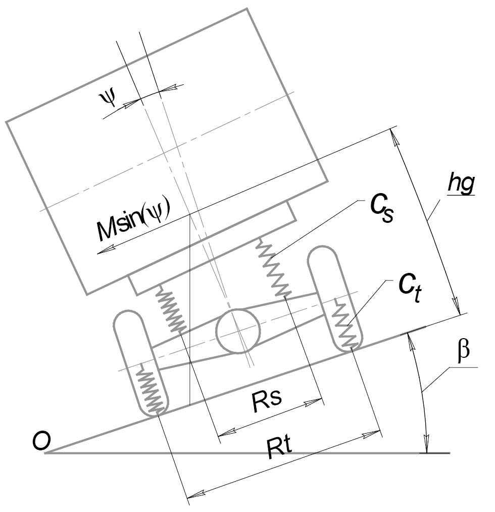 The transverse component M sin(ψ) of the vehicle gravity, having an arm hg, forms an overturning force that accounts for the elastic properties of the elastic elements of the suspension and pneumatic tires [14, 37]: