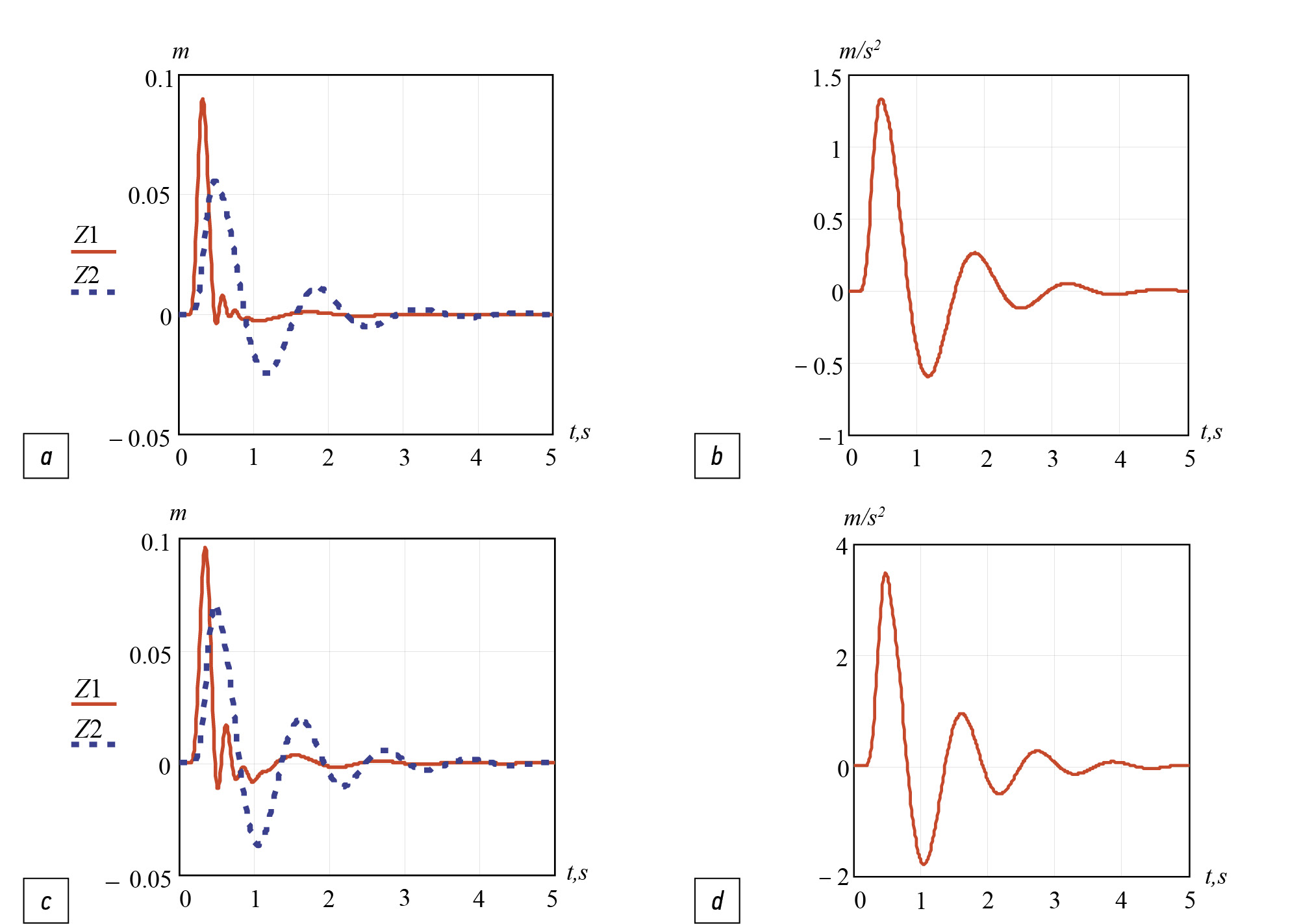 The resulting displacements of the vehicle masses as it moves over road irregularities are analyzed by calculating the acceleration values of these masses, while their spread reaches large values. The system of differential equations (3), reduced to the Cauchy form, does not allow for a direct numerical solution of mass acceleration. Therefore, for the numerical solution of mass acceleration, the following equation was used [9, 10, 20, 21]:
