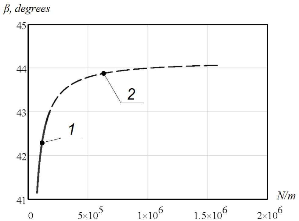 Рис. 7. Влияние жёсткости упругого элемента амортизатора на статическую поперечную устойчивость машины на косогоре: 1 — зависимость при использовании ПГА с дополнительной пневматической камерой; 2 — зависимость при использовании ПГА без дополнительной пневматической камеры.