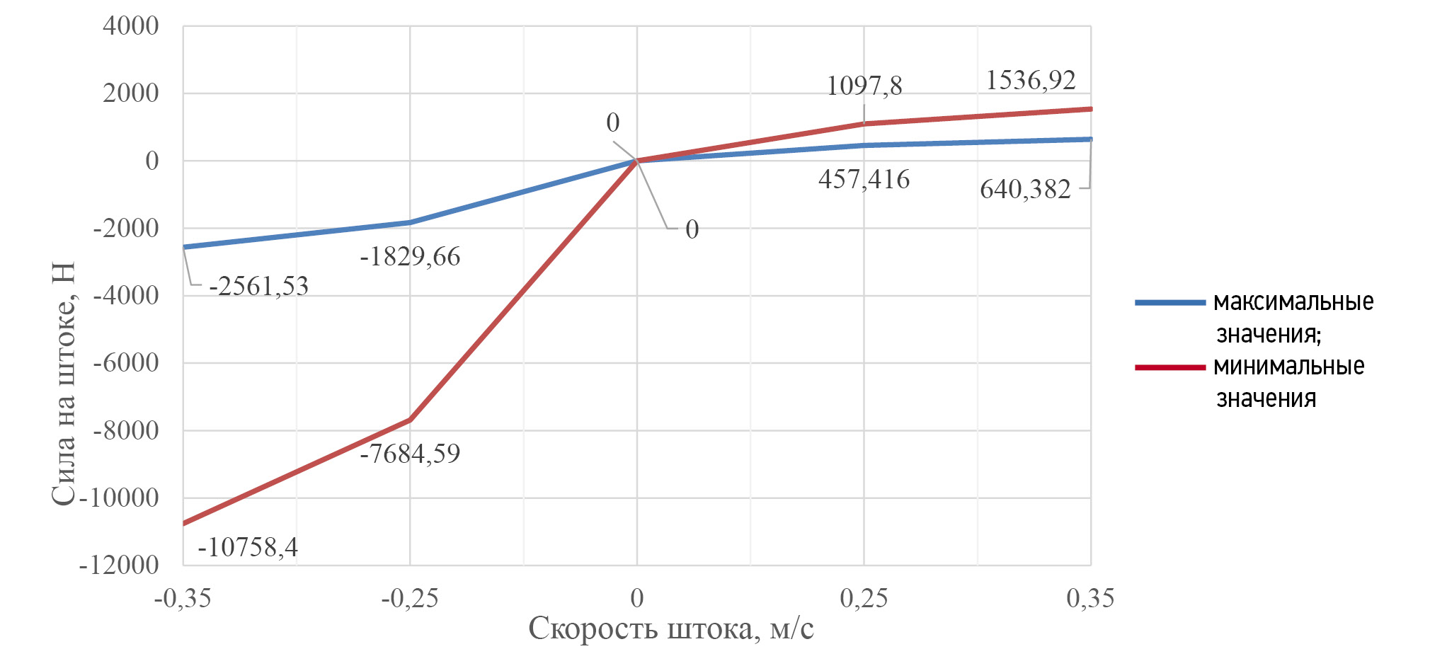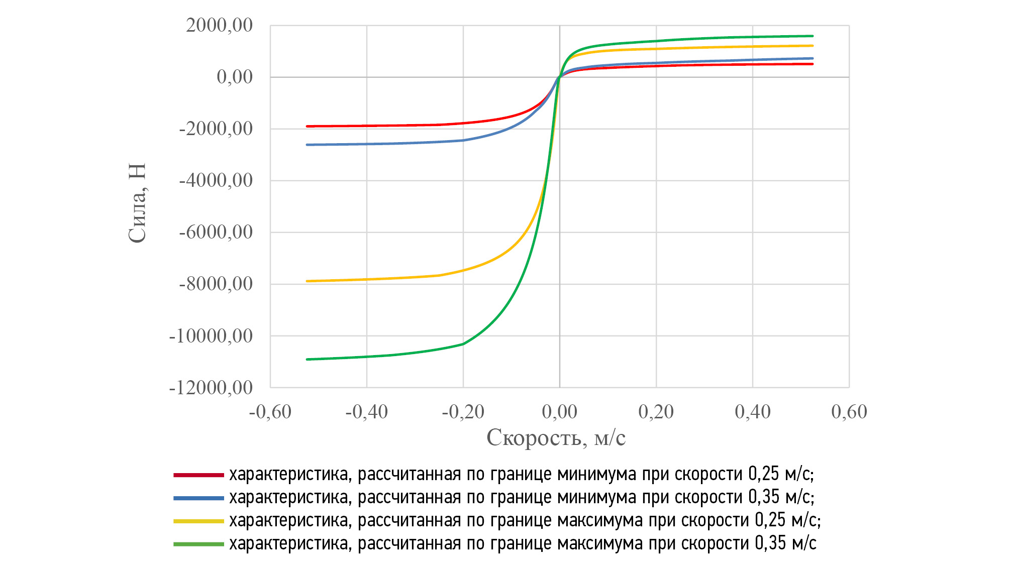 Для подбора требуемой демпфирующей характеристики и подтверждения работоспособности и эффективности метода было произведено имитационное моделирование на динамической модели транспортного средства в разных весовых состояниях с различными характеристиками амортизатора, представленными на рис. 3. Характеристику, наиболее приближённую к оси абсцисс (с наименьшими силами на штоке) будем называть минимальной, а характеристику, наиболее отдалённую от оси абсцисс — максимальной.