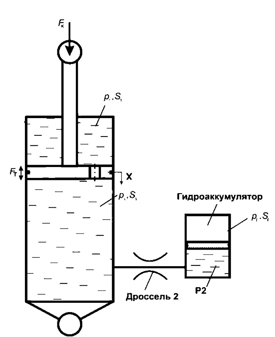 где — плотность рабочей жидкости, кг/м3; — коэффициент расхода через дроссель; — площадь проходного сечения дросселя 1; — площадь проходного сечения дросселя 2.