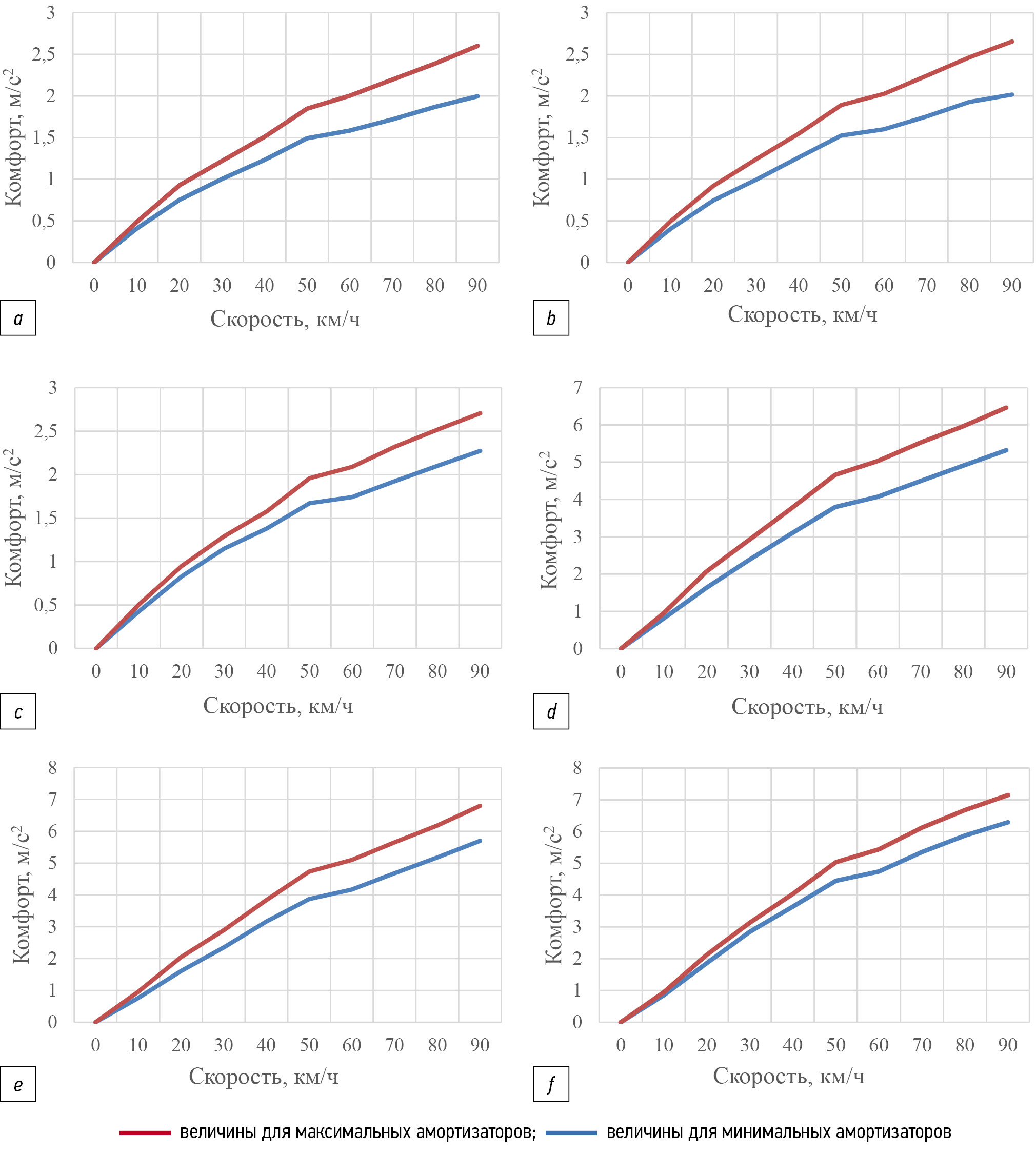 Рис. 4. Графики уровней комфорта ТС в зависимости от скорости движения ТС для амортизатора с минимальной и максимальной характеристиками: a — для одиночного ТС по дороге 1-ой категории неровностей; b — для автопоезда снаряжённой массы по дороге 1-й категории неровностей; c — для автопоезда полной массы по дороге 1-й категории неровностей; d — для одиночного ТС по дороге 2-й категории неровностей; e — для автопоезда снаряжённой массы по дороге 2-й категории неровностей; f — для автопоезда полной массы по дороге 2-ой категории неровностей.