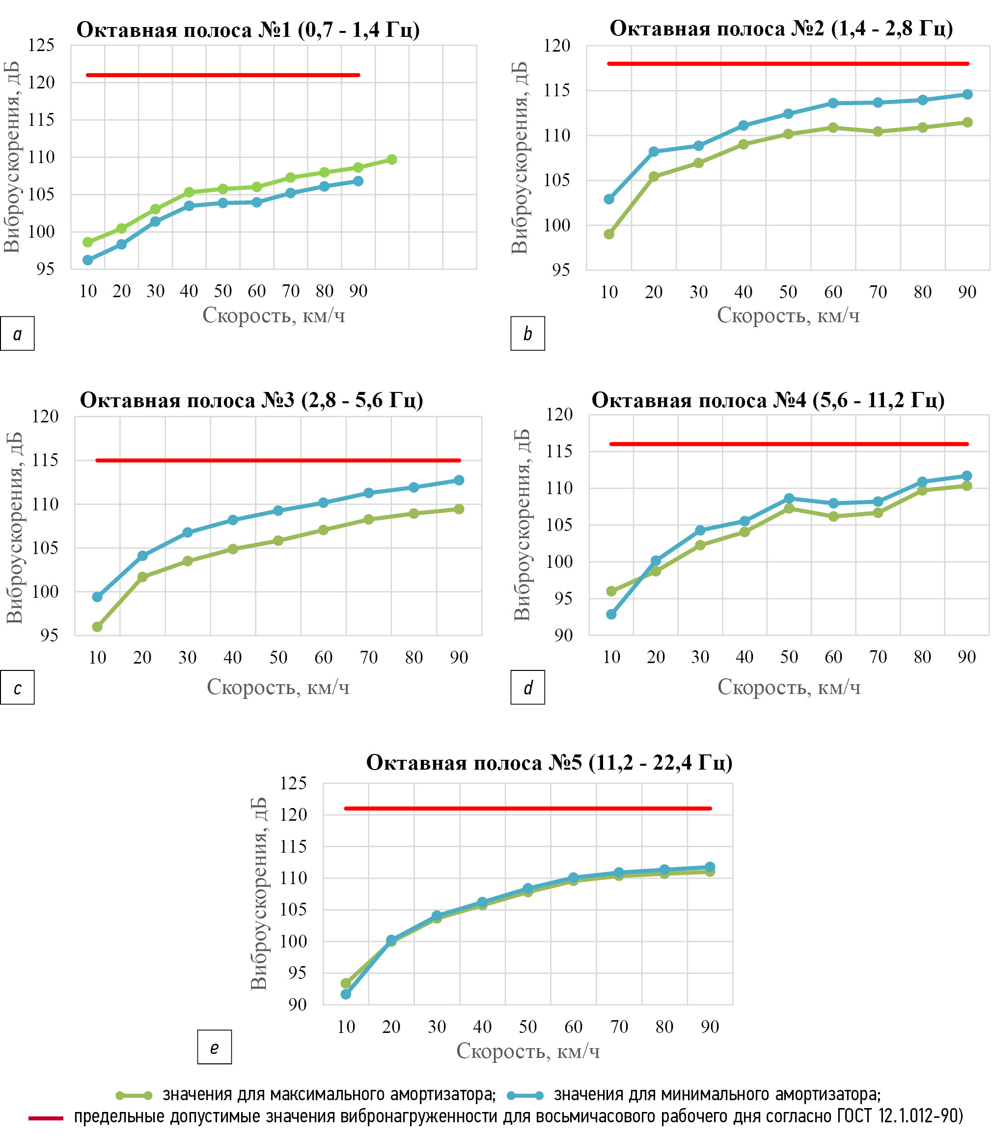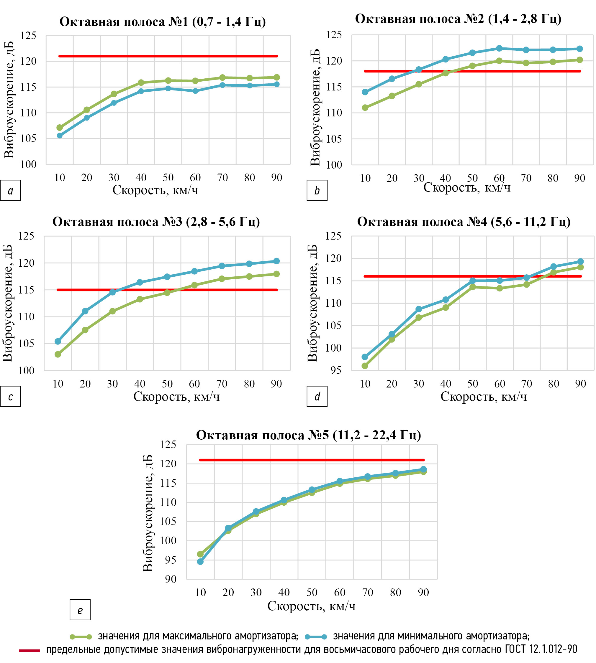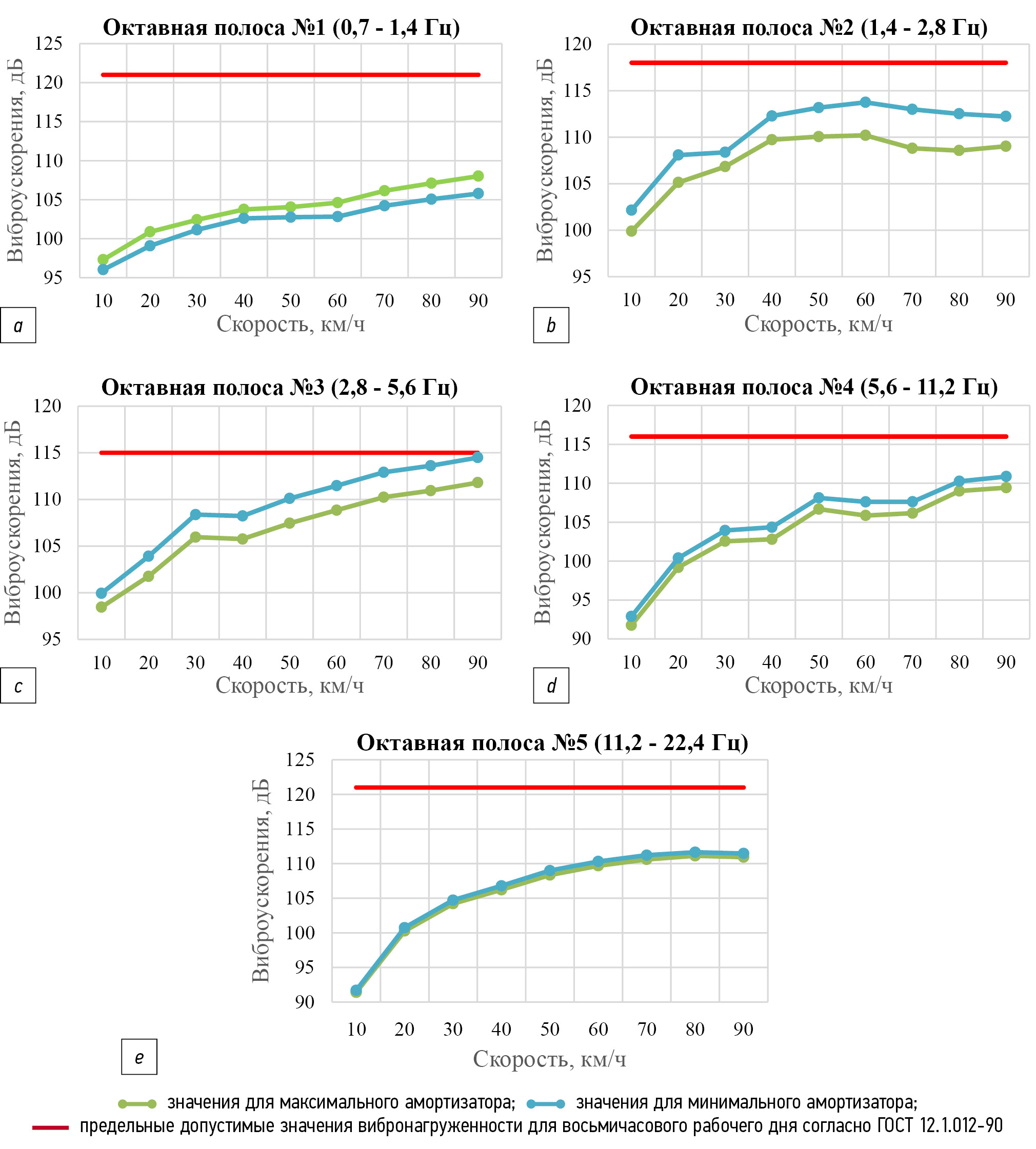 Рис. 8. Уровни вибронагруженности кабины при движении одиночного ТС по дороге второй категории неровностей: а — первая октавная полоса частот; b — вторая октавная полоса частот; c — третья октавная полоса частот; d — четвёртая октавная полоса частот; e — пятая октавная полоса частот.