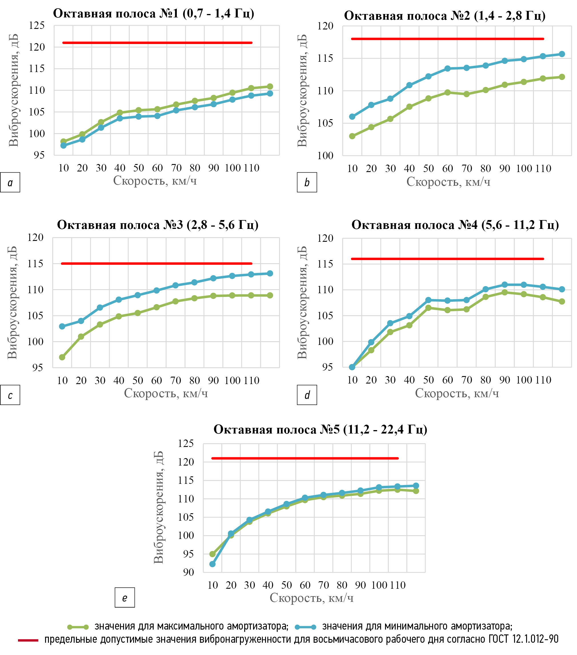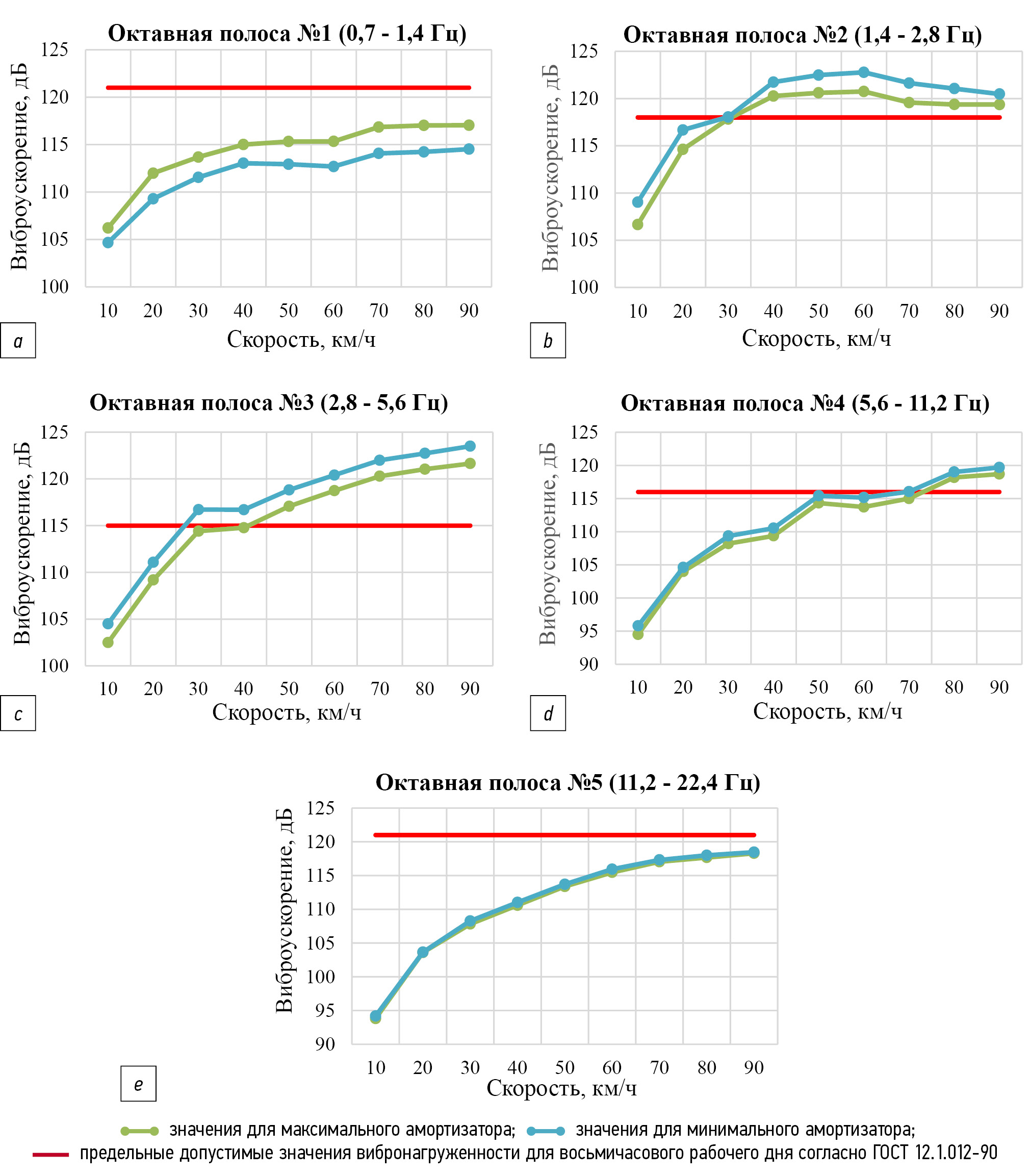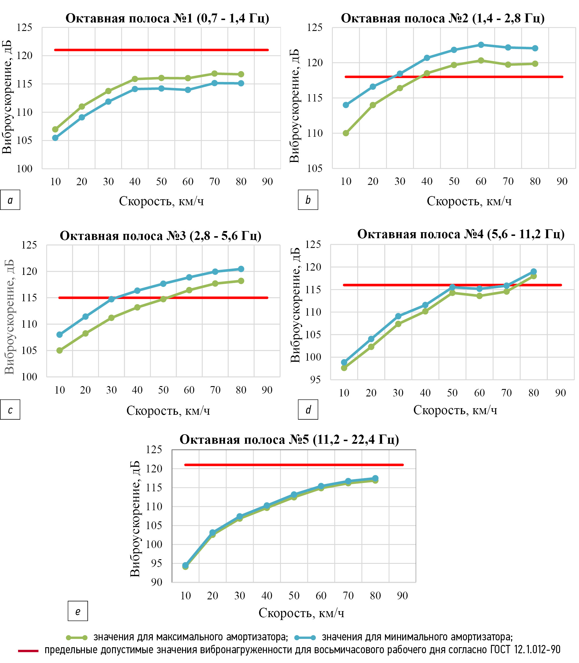 Рис. 8. Уровни вибронагруженности кабины при движении одиночного ТС по дороге второй категории неровностей: а — первая октавная полоса частот; b — вторая октавная полоса частот; c — третья октавная полоса частот; d — четвёртая октавная полоса частот; e — пятая октавная полоса частот.