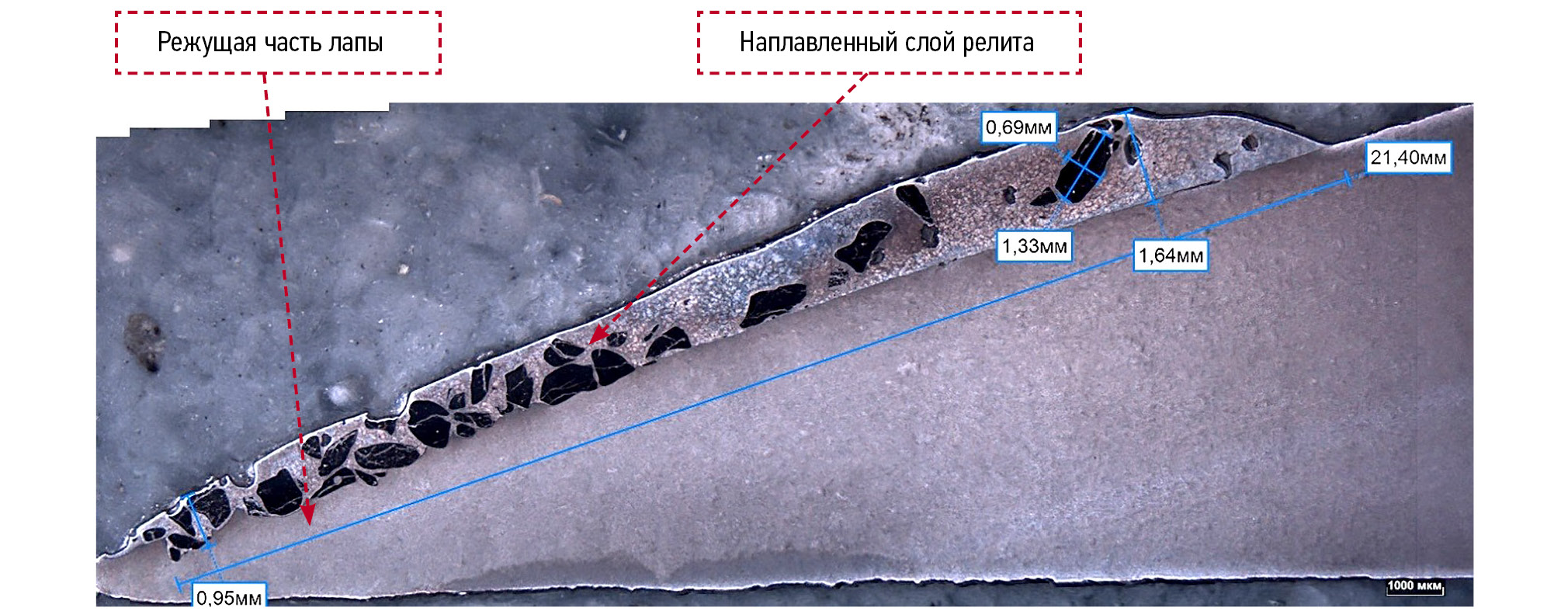 Геометрические размеры наплавленного слоя релита соответствуют технической документации предприятия для данного типа культиваторных лап и составляют: