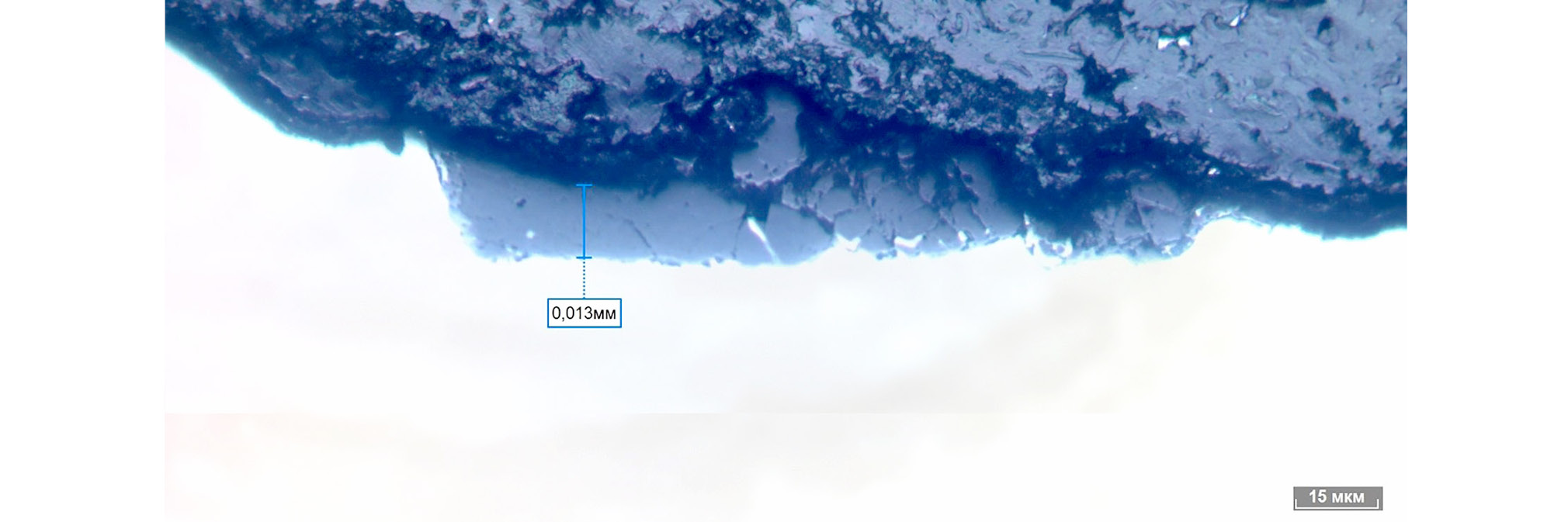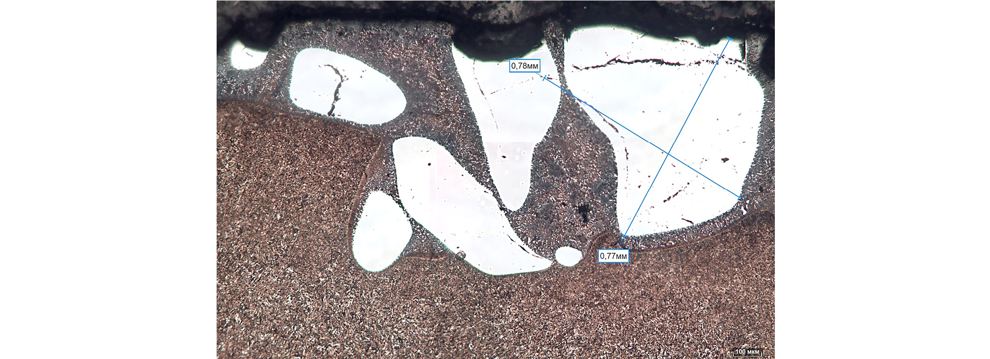 В процессе исследований в наплавленном слое выявлено наличие пор максимальным размером ~ 0,37×0,47 мм, заполненных шлаком (рис. 4), что не критично для данного типа изделий, но требует более тщательной подготовки наплавляемой поверхности и более точного соблюдения режимов технологии наплавки релита. Под наплавкой имеется никелевая подложка максимальной толщиной ~ 0,009 мм (рис. 5), что обеспечивает высокую прочность сцепления наплавленного слоя со стальной основой.