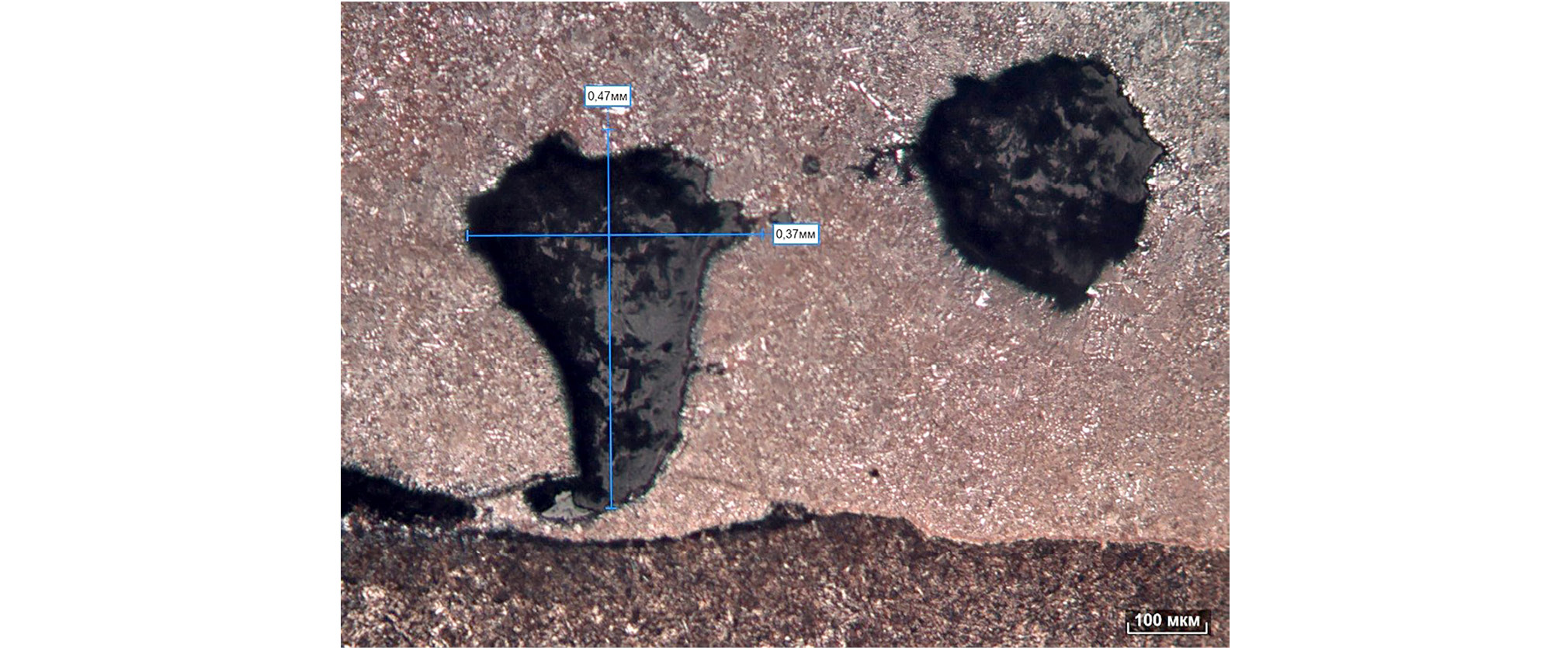 Рис. 4. Заполненные шлаком поры в материале наплавки детали, ×100.