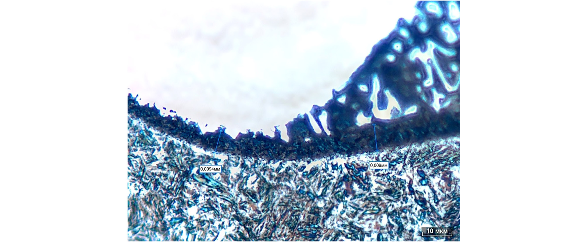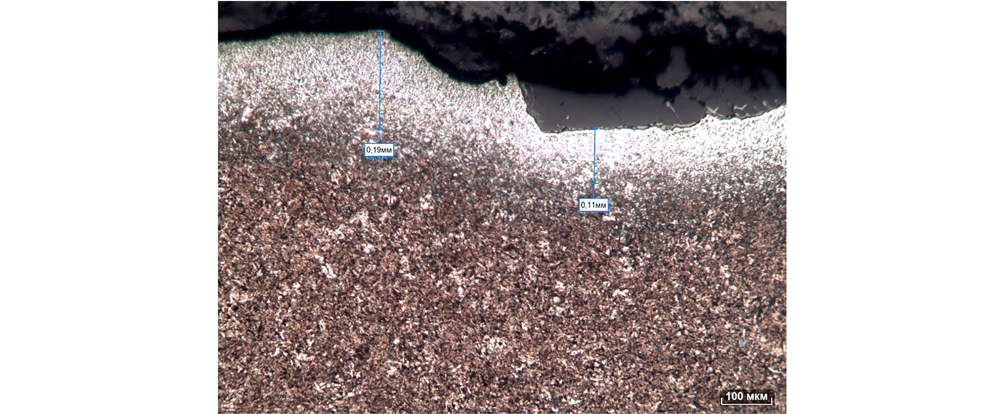 Микроструктура основного металла детали представляет собой троостомартенсит с микротвёрдостью ~ 564 HV 0,3 (рис. 7). Как известно, троостомартенситная структура сталей отличается высокой прочностью и упругостью и более низкими, по сравнению с мартенситом, остаточными внутренними напряжениями, что позволяет обеспечивать высокую износостойкость материала.
