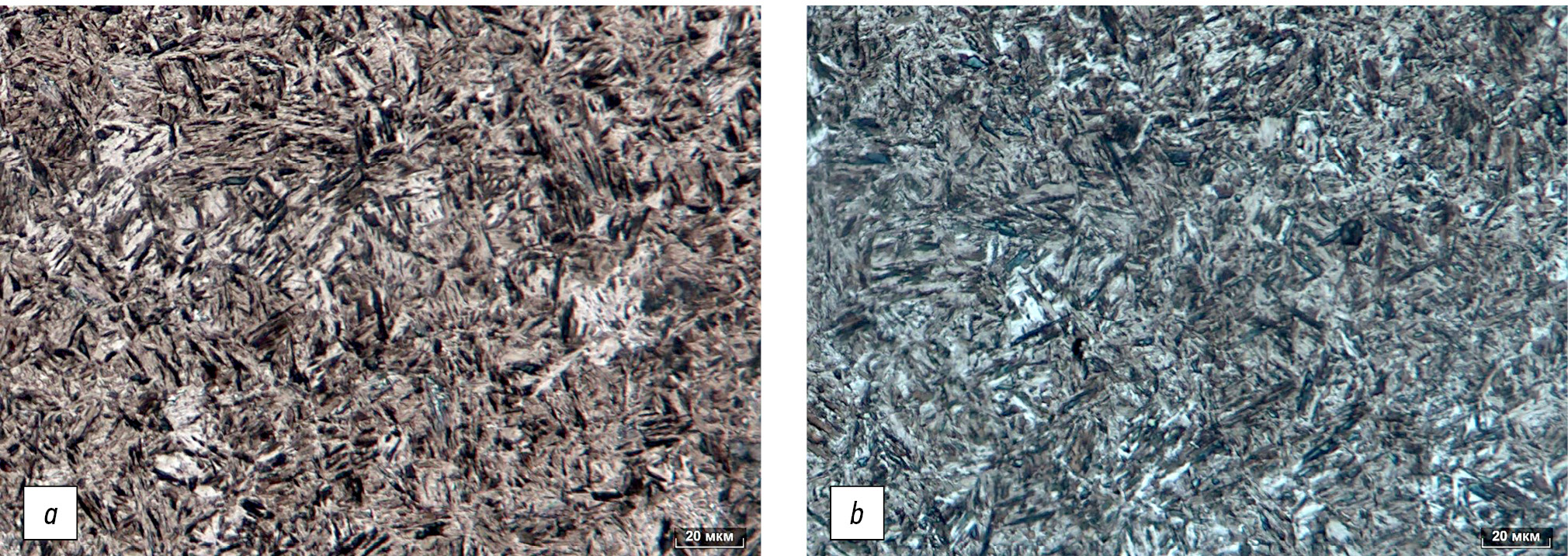 Рис. 7. Микроструктура основного металла детали, ×500: а — в сердцевине; b — вблизи режущей кромки.