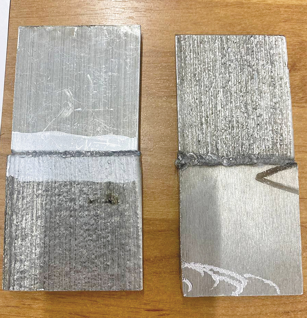 Рис. 3. Сваренные пластины из напечатанного АМг5 и сплава 6082Т4 (слева) и напечатанного АМг5 и листового АМг5 (справа).