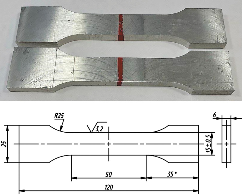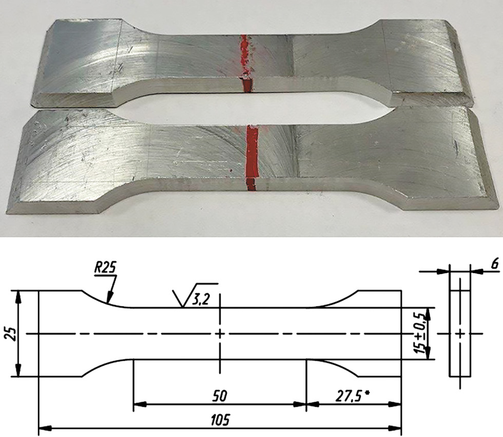 Напечатанная заготовка из сплава АМг5 была разделена и сварена с листовым сплавом АМг5 и сплавом 6082Т4 ручной лазерной сваркой (рис. 3) для образцов, испытываемых на растяжение, и в среде защитных газов для образцов, испытываемых на ударную вязкость. Термическая обработка образцов после сварки не проводилась, с образцов было снято усиление шва, а также поверхностные неровности после печати при помощи механической обработки поверхности образца. Размеры образцов и их последующая механическая обработка выбирались для испытания по [1] и ГОСТ 6996-66 [10].