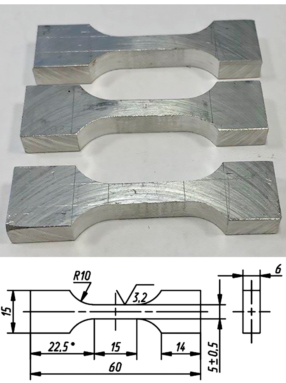 Эскизы и фотографии образцов для испытания на растяжение приведены на рис. 5–7.