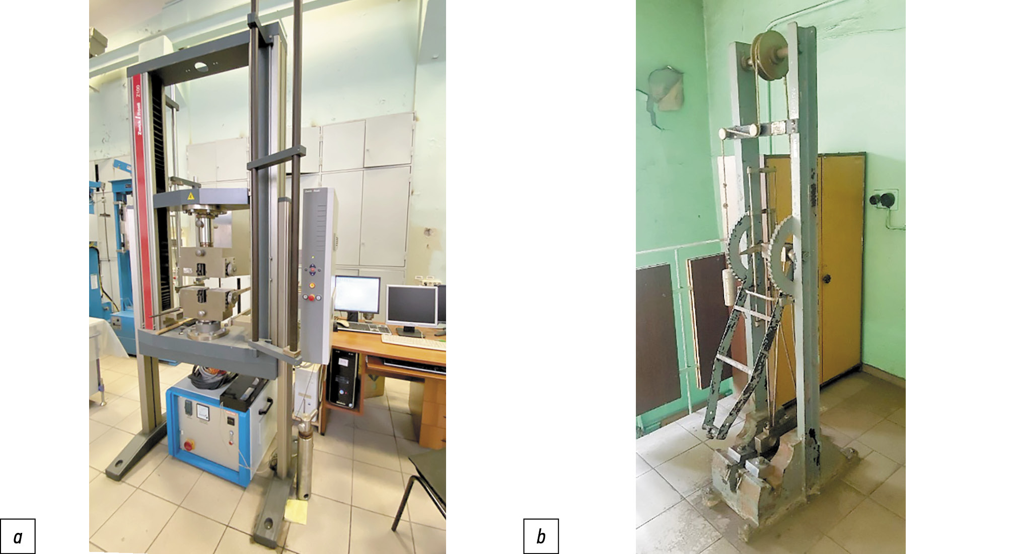 Рис. 8. Испытательное оборудование: а — универсальная испытательная машина Zwick/Roell серии Allround Z100; b — маятниковый копер МК-30.
