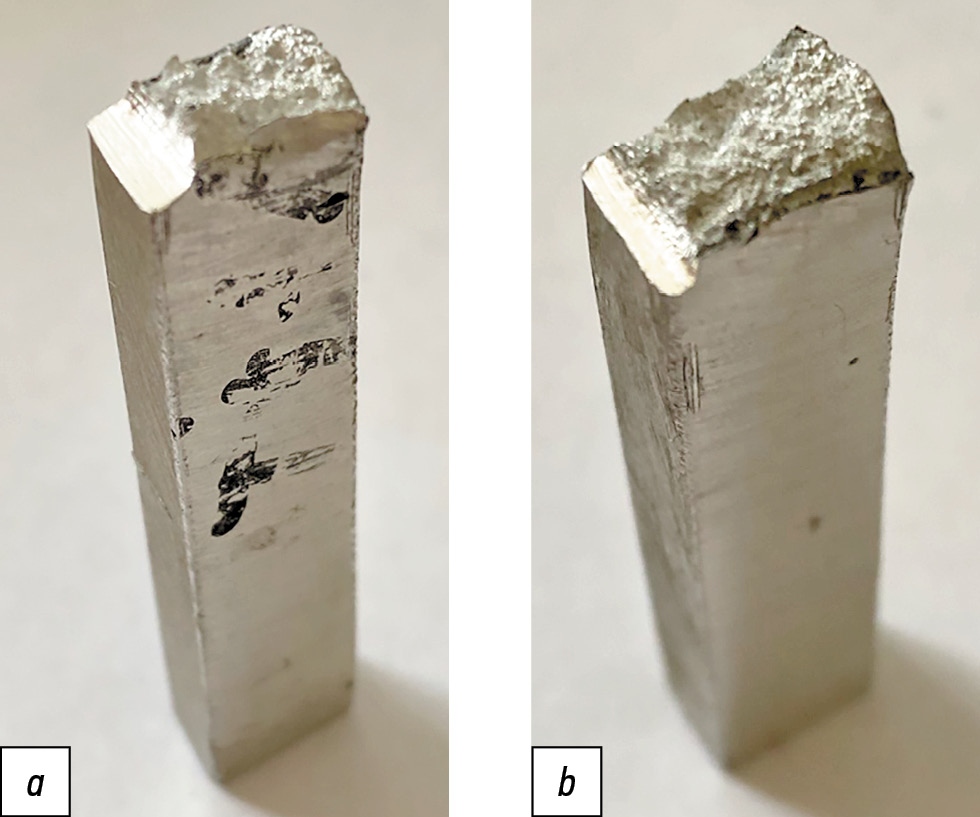Рис. 9. Разрушенные образцы после испытания на ударную вязкость: а — 6082Т сваренный с напечатанным алюминием; b — АМг5, сваренный с напечатанным алюминием.