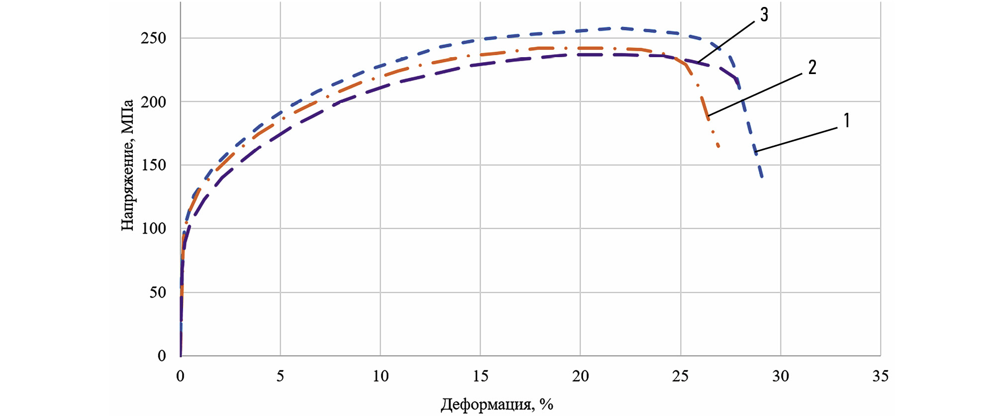 Рис. 10. Зависимость напряжения, МПа, и деформации, %, при испытании на растяжение образцов из напечатанного алюминия (образец материала без сварки): 1 — образец № 1; 2 — образец № 2; 3 — образец № 3.