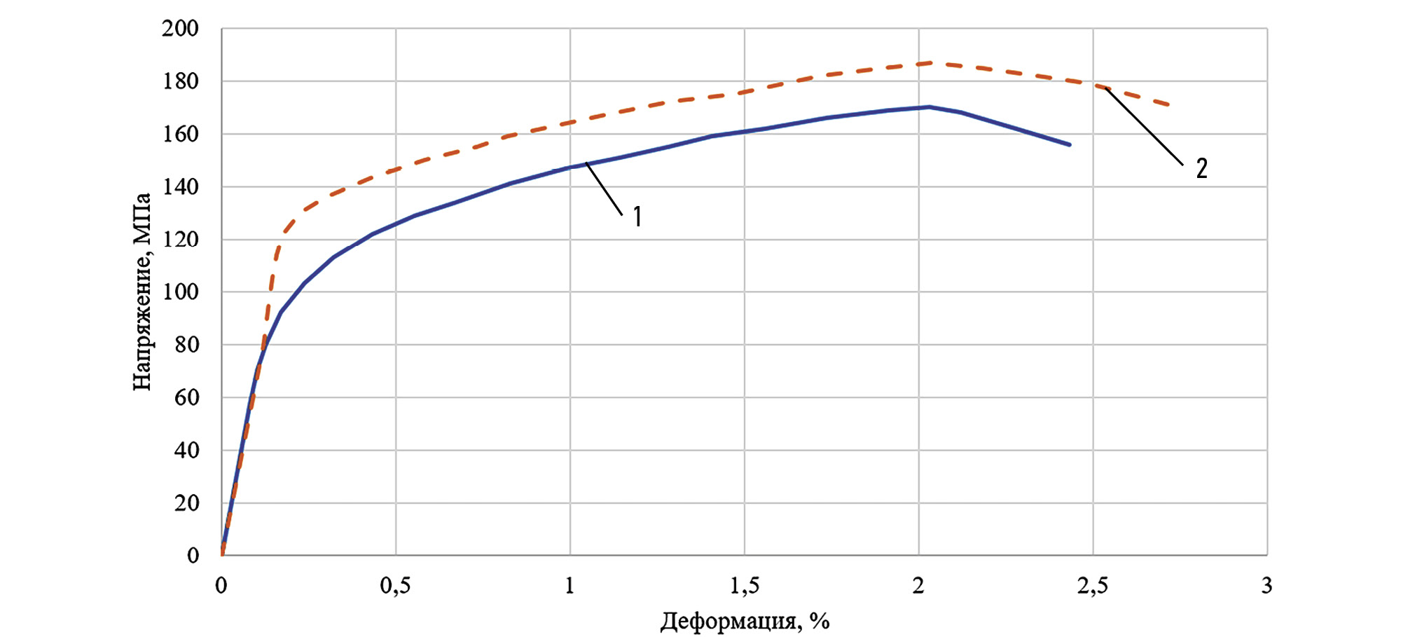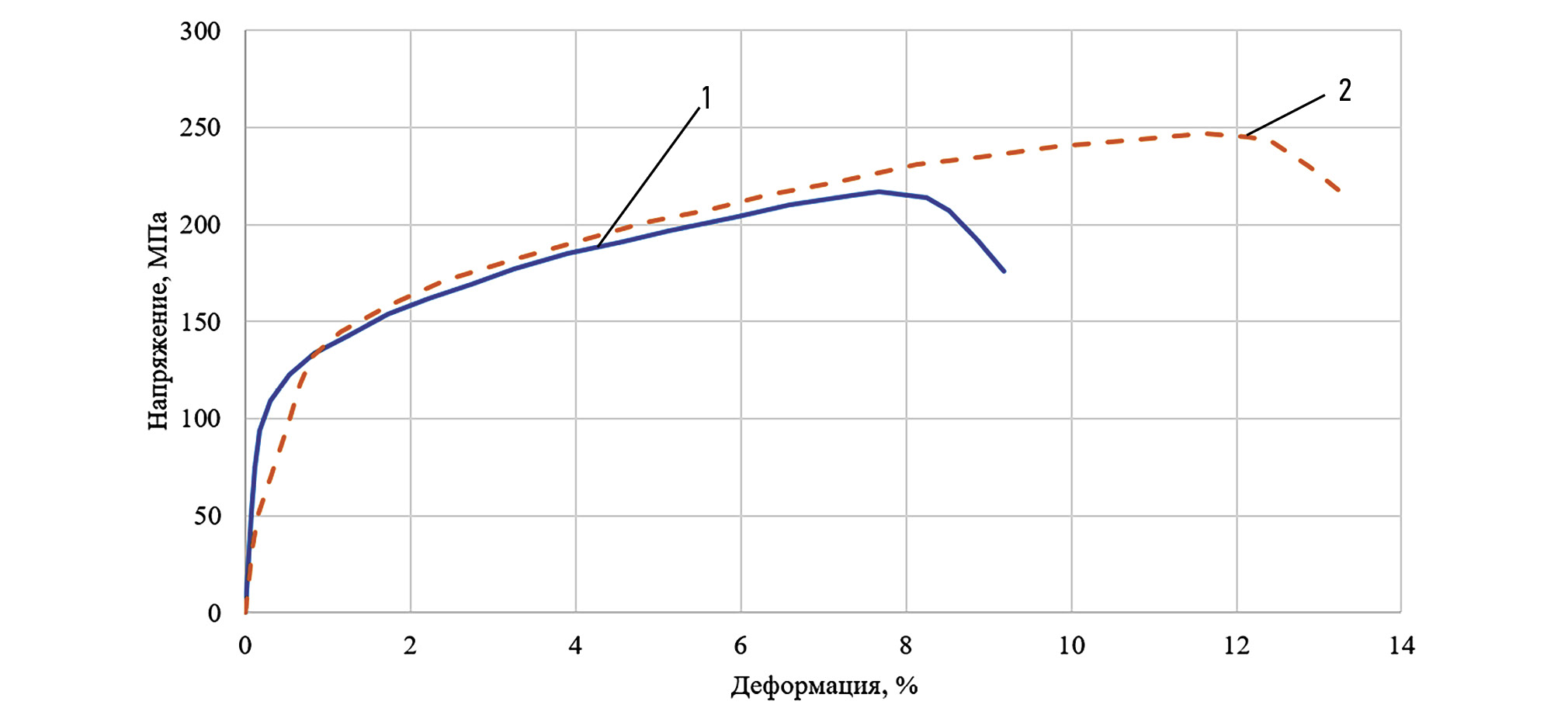 Рис. 14. Зависимость напряжения, МПа, и деформации, %, при испытании на растяжение образцов из напечатанного алюминия, сваренного с 6082Т4: 1 — образец № 1; 2 — образец № 2.