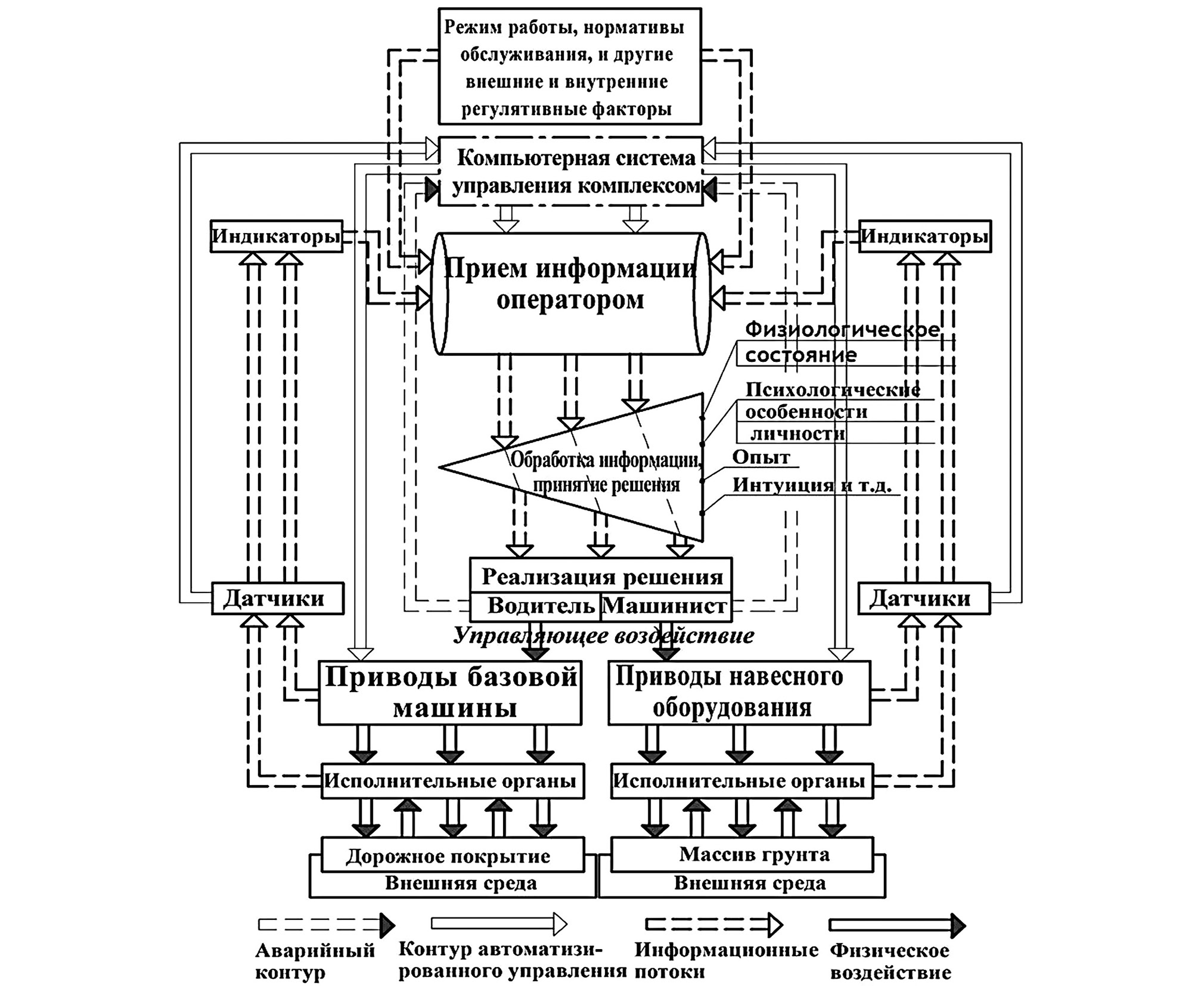 На сегодняшний день, можно отметить два аспекта, которые существенно влияют на особенности эксплуатации машин сельскохозяйственного назначения: с одной стороны особенности выполнения сельхозработ, связанные с весьма ограниченными сроками их проведения (привязка к срокам уборки урожая и т. д.) ставят задачу обеспечения максимальной технической готовности парка техники именно в этот период. Вторым обстоятельством является то, что внедрение информационных технологий и современных бортовых систем коренным образом меняет взаимодействие между человеком и машиной. Таким образом, современная машина представляет собой человеко-машинную систему, структуру которой можно показать в виде схемы на рис. 1.