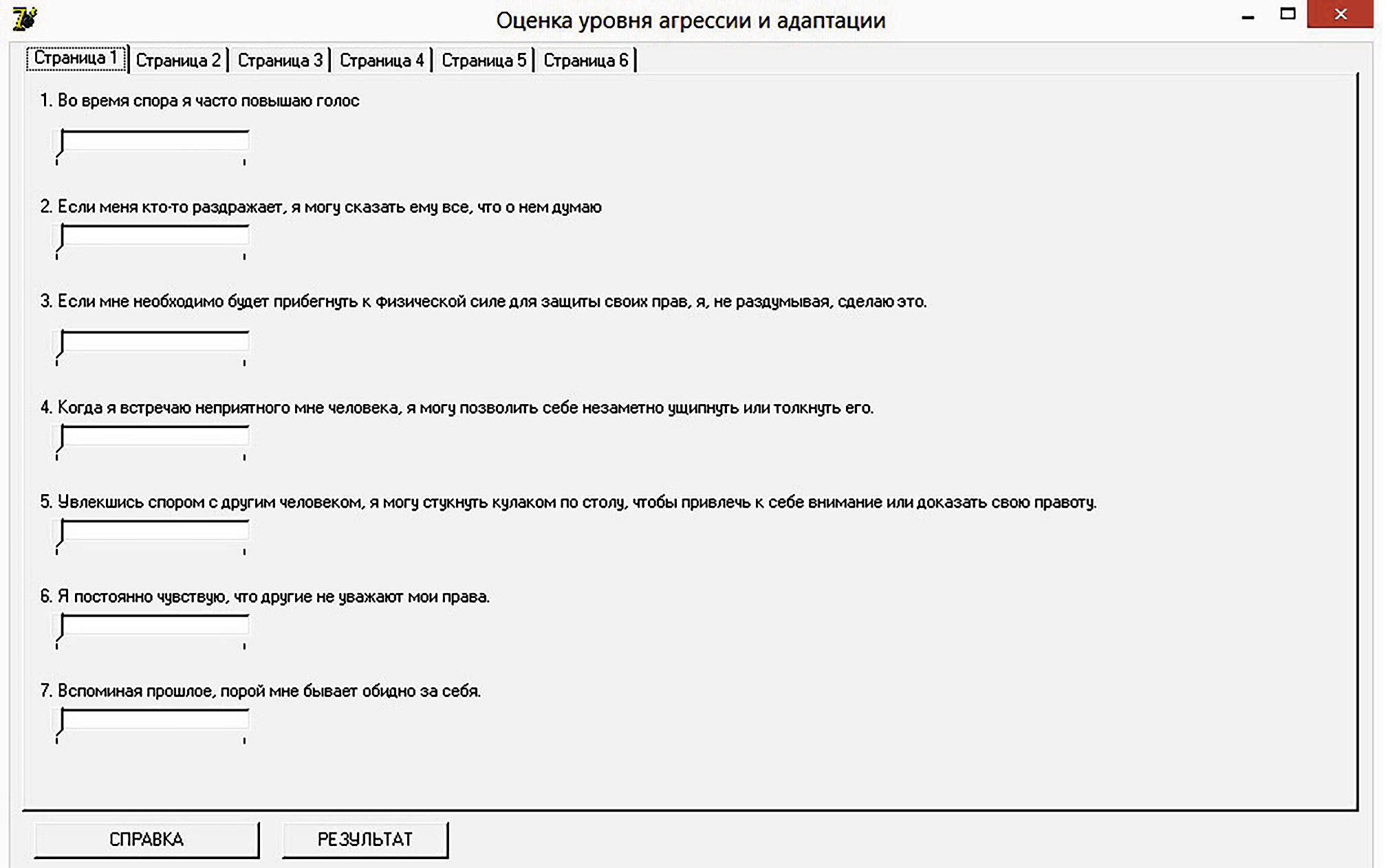 Также были применены прикладные программные средства для оценки ряда факторов (уровня агрессии и адаптации (агрессивное поведение), степени готовности к рисковым ситуациям (рисковое поведение)), связанных с рисками в части человеческого фактора [18–20]. Пример интерфейса программы приведен на рис. 5.