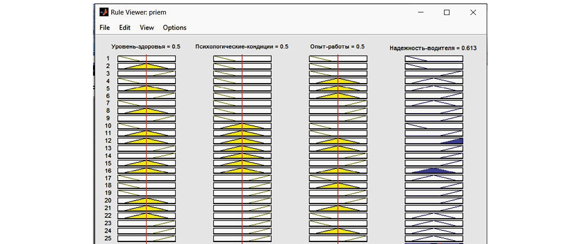 Анализируя данные на рис. 6–7, можно сказать, что часть факторов риска могут быть оценены инструментальными методами. Однако сделать это для всех факторов невозможно в силу неопределённости исходных данных и качественного характера факторов [20]. В этом случае необходимо использовать модель нейро-нечёткой логики, пример которой приведен на рис. 8–9.