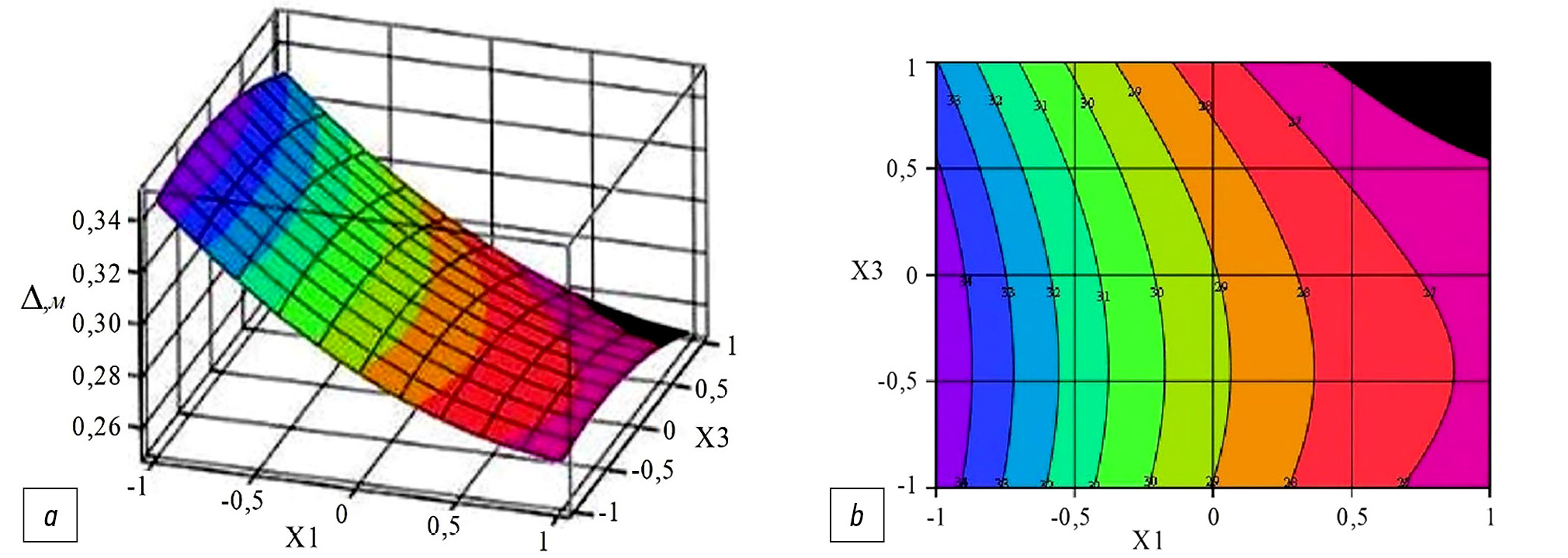 В результате компьютерной обработки получена математическая модель в виде полинома второй степени, адекватно описывающая исследуемый процесс в кодированных пределах факторного пространства: