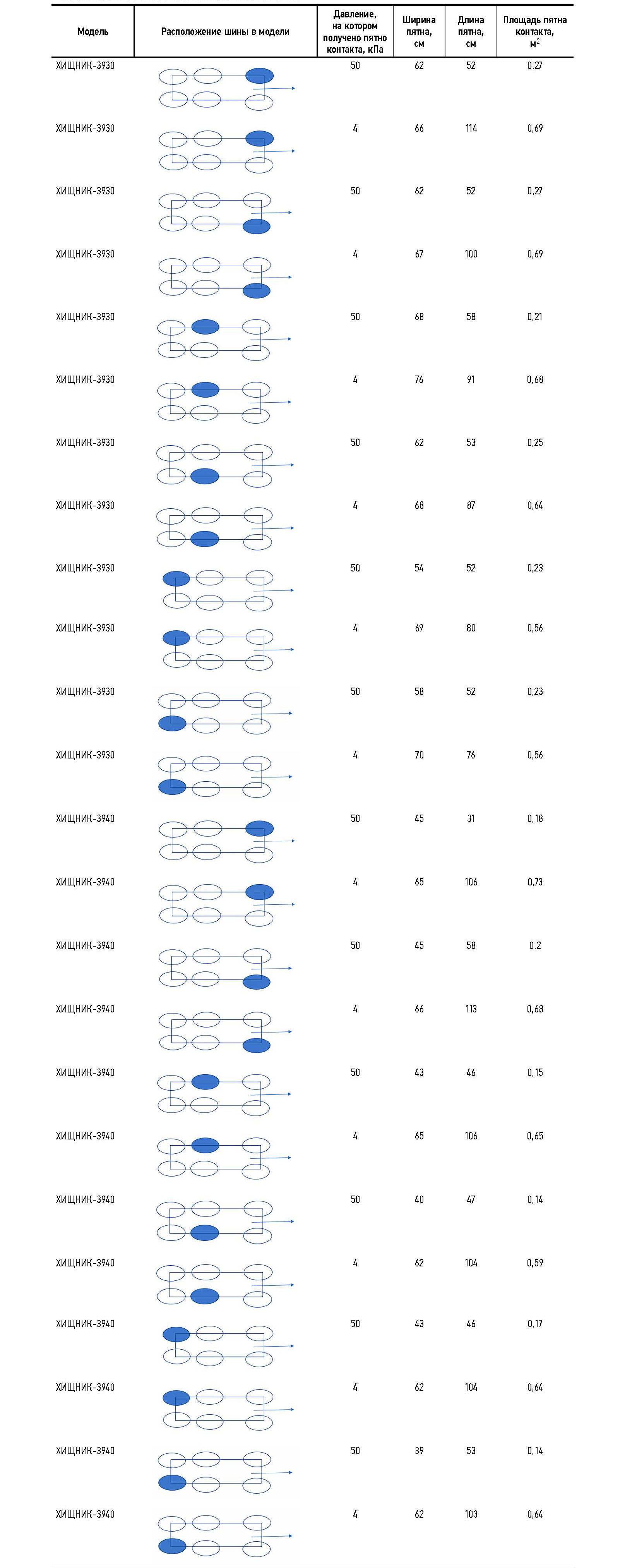 Таблица 10. Измеренная опытным путём площадь пятна контакта снегоболотохода на шинах сверхнизкого давления ХИЩНИК-3940, колёсная формула 6×6 с колёсным оборудованием Мамонт 1780×710-32, давление в шинах 4 кПа