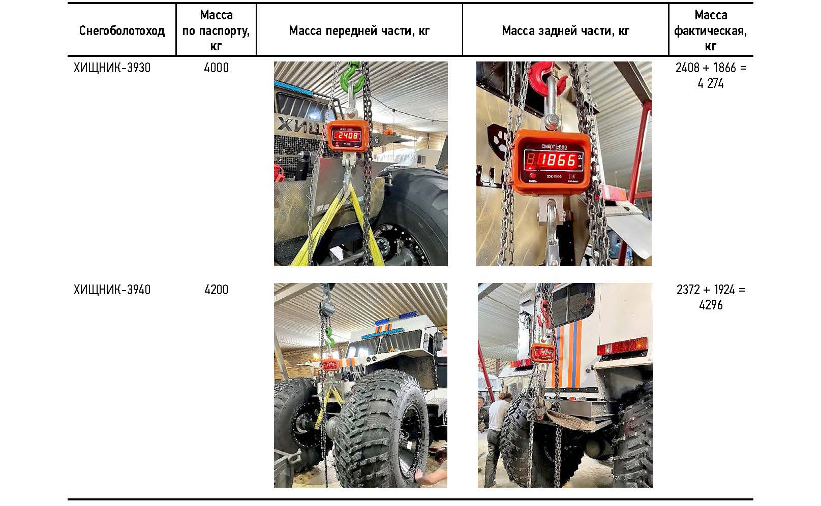 Таблица 2. Реальная измеренная масса снегоболотоходов ХИЩНИК-3930 и ХИЩНИК-3940