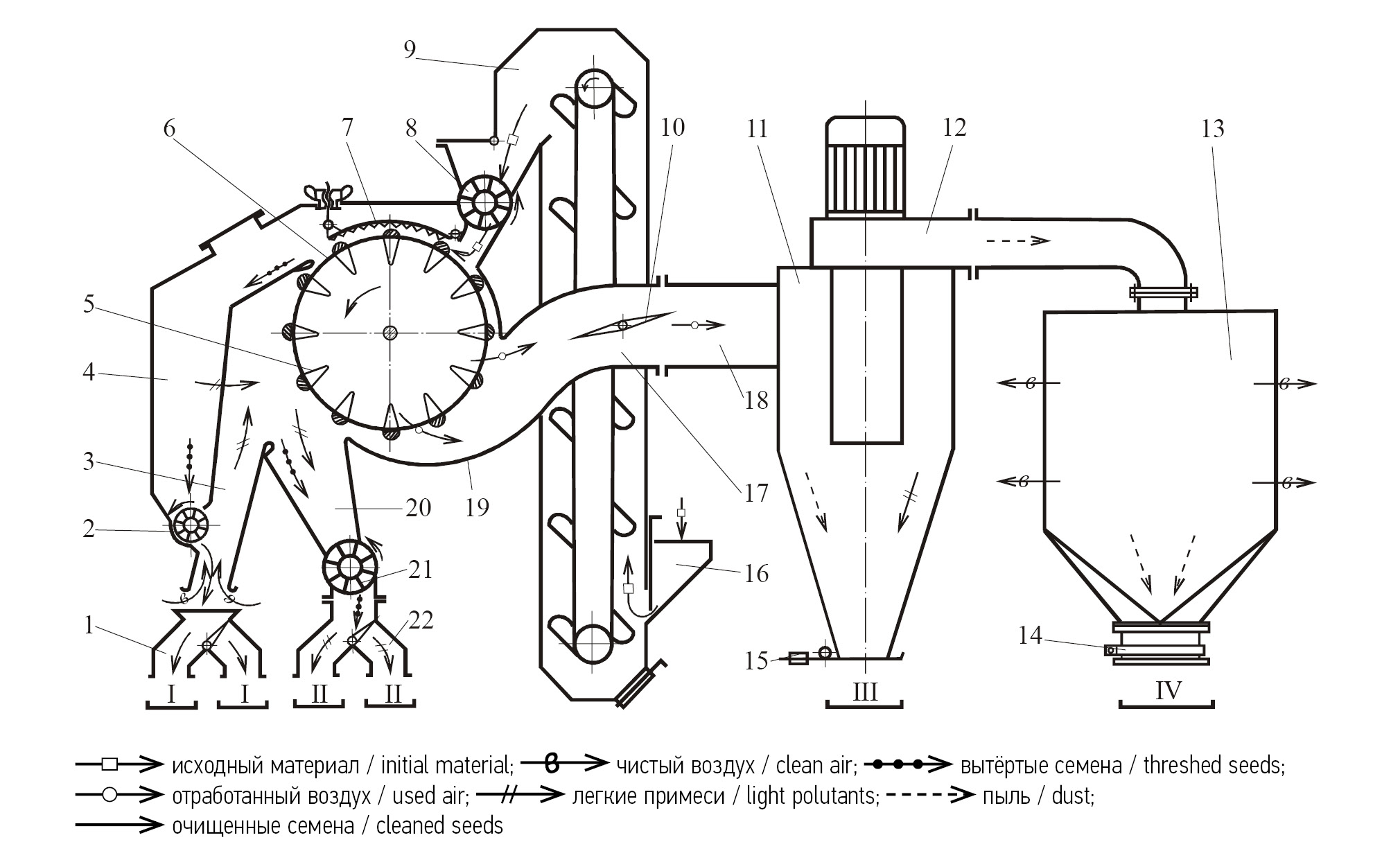 Fig. 1. Technological diagram of the KS-1.0 clover thresher-separator: 1, 22 — flow switches; 2 — a feeding roller; 3 — a pneumatic separating channel; 4 — a suction chamber; 5 — a V-shaped drum vane; 6 — a beater drum; 7 — a threshing surface; 8 — a feeding drum; 9 — a bucket elevator; 10 — a throttle; 11 — a cyclone; 12 — an electric fan; 13 — a fabric filter; 14 — a bag holder; 15 — a valve; 16 — a loading hopper; 17 — an outlet; 18 — an air supply pipe; 19 — a fan body; 20 — a sediment chamber; 21 — a sluice valve; I, II —outlets for cleaned seeds and second-quality seeds; III, IV — outlets for light pollutants and dust.