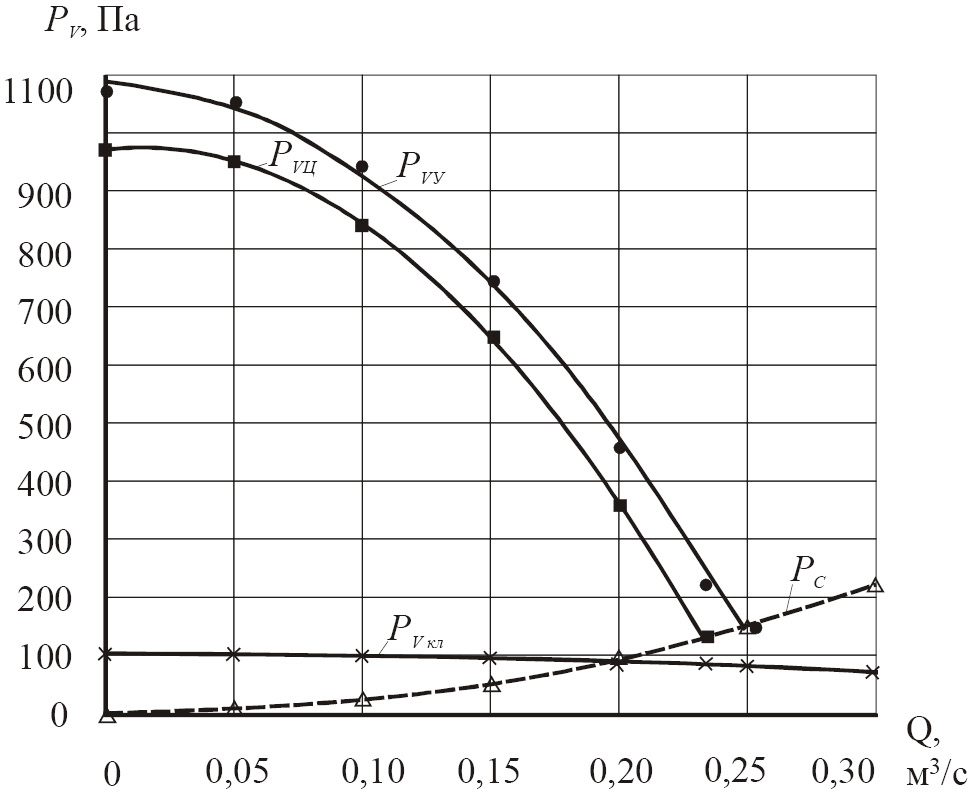 Ротационный поперечно-поточный пылеуловитель, который функционирует как диаметральный вентилятор, имеет некоторые особенные характеристики. При частоте вращения бильного барабана равной 1300 оборотов в минуту, он достигает максимального расхода воздуха на холостом ходу, равного 0,38 м3/с при полном давлении 60 Па. Это соответствует скорости воздуха в пневмосепарирующем канале, равной 7,5 м/с. Форма характеристики полного давления PVкл в зависимости от расхода Q имеет монотонно убывающий характер. Максимальное полное давление PVmax, которое достигается при Q = 0, составляет 105 Па. Центробежный вентилятор циклона, который используется вместе с пылеуловителем, имеет внешний диаметр колеса 0,21 м и 32 загнутые вперед цилиндрические лопатки. При частоте вращения колеса 3000 оборотов в минуту и работе на всасывающей и нагнетательной ветвях сети, вентилятор развивает расход воздуха QЦ, равный 0,23 м3/с при полном давлении PVЦ, равном 130 Па. Наибольшее полное давление PVЦ, которое достигается при Q = 0, составляет 980 Па.