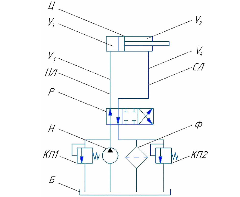 Рис. 1. Гидравлическая схема с гидроцилиндром: Б — гидробак; Н — насос, Р — гидрораспределитель, НЛ — напорная гидролиния, Ц — гидроцилиндр, СЛ — сливная гидролиния, Ф — фильтр, КП1 и КП2 — предохранительные клапаны; V1 — объём жидкости в напорной гидролинии, V2 — объём жидкости в сливной гидролинии, V3 — объём поршневой полости гидроцилиндра; V4 — объём штоковой полости гидроцилиндра.