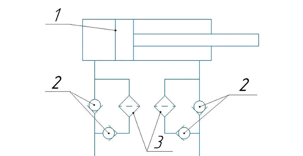 Одним из вариантов изменения конструкции гидравлической системы для минимизации влияния затрудненной циркуляции является установка дополнительных фильтрующих элементов. На рис. 4 представлена условная схема оборудования для фильтрации рабочей жидкости в узлах с затрудненной циркуляцией рабочей жидкости. В данной компоновке присутствуют обратные клапаны 2, которые направляют потоки жидкости, вытесняемой из гидроцилиндра 1, через фильтры 3, исключая реверс потока через фильтроэлемент. Рабочая жидкость, вытесняемая из гидроцилиндра, очищается в фильтре, что снижает интенсивность износа и вероятность выхода из строя узла.