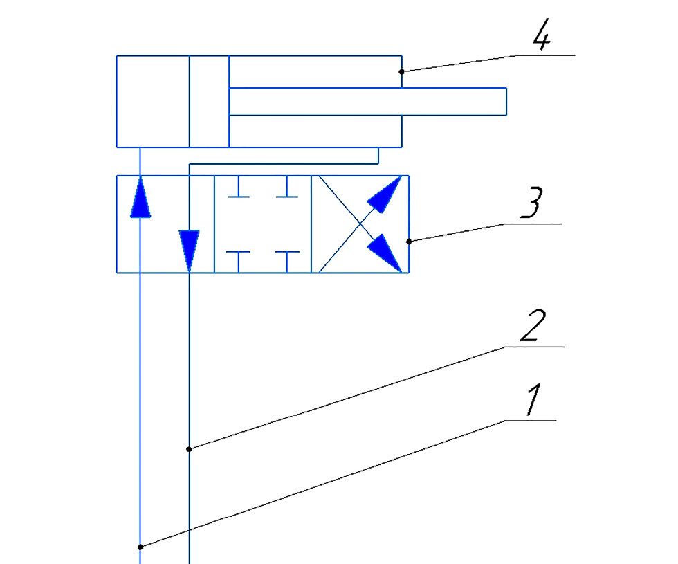 Рис. 5. Изменение месторасположения органа управления: 1 — напорная линия; 2 — сливная линия, 3 — гидрораспределитель; 4 — гидроцилиндр.
