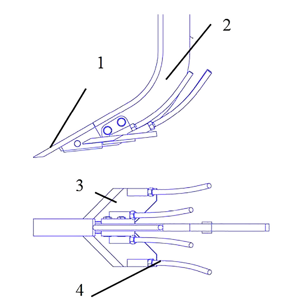 Fig. 1. The working body of the deep tiller (general view): 1 — chisel; 2 — rack; 3 — flat–cut paw; 4 — rods.