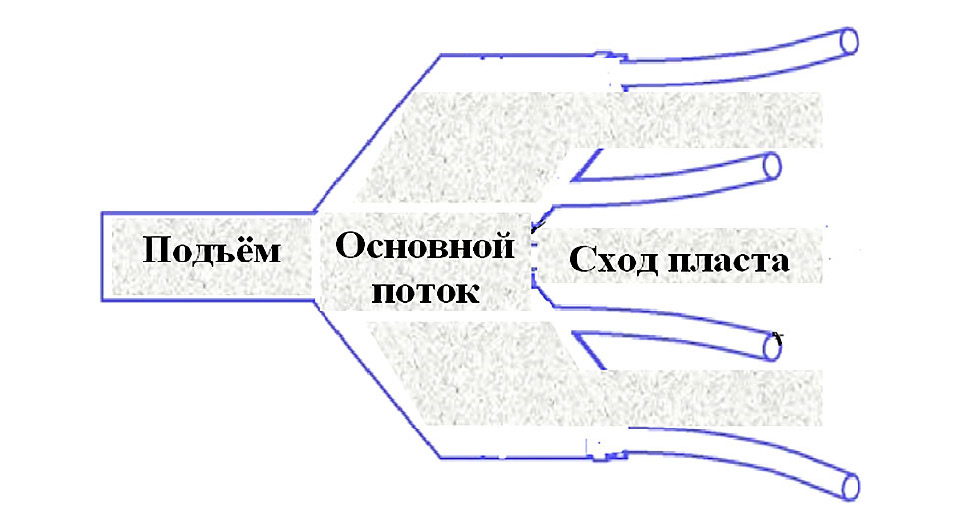При затруднённом сходе пласта может возникнуть изменение вектора силы основного потока, в результате чего почва перемещается не в сторону задней торцевой части рабочего органа, а в противоположном направлении, стремясь к сгруживанию на долоте и на плоскорезных лапах.