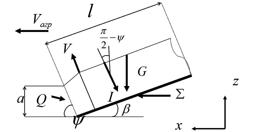 Рабочий орган глубокорыхлителя, установленный под углом крошения к дну борозды β, в процессе функционирования испытывает силовое взаимодействие с пластом: от ∑ — результирующей сопротивления почвы и трения, действия инерции I , связанной с углом сдвига ψ , тяжести почвы G , выраженное в прямоугольной системе координат проекциями на оси x и z :