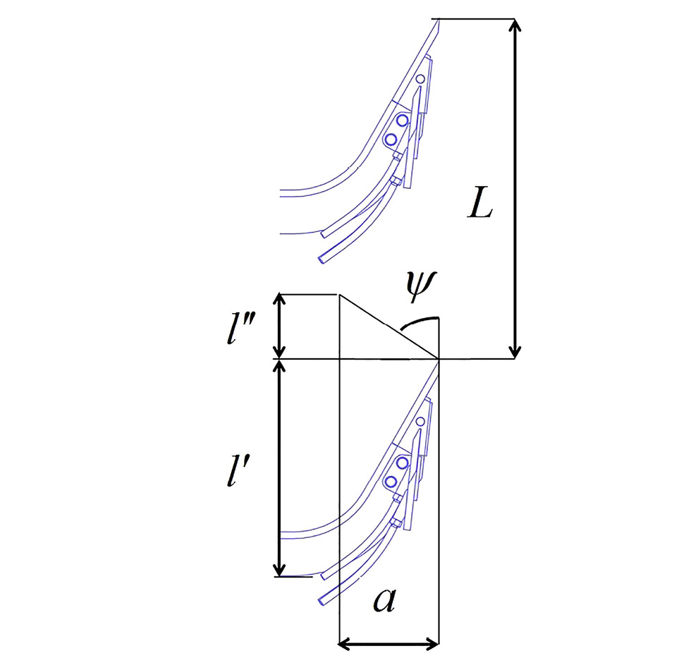 где l′ — конструктивный размер, характеризующий длину рабочего органа (вылет стойки) в проекции на продольно-горизонтальную плоскость, м; l″ — поле напряжений почвы в продольном направлении, м.