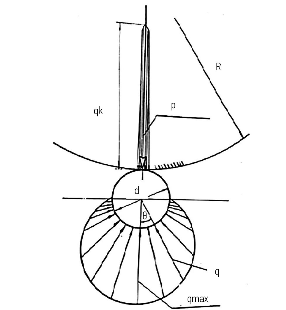 Как показано выше, равнодействующая эпюры контактных давлений от действия катка равна . Максимальное контактное давление (напряжение) qк в МПа от действия катка на клубень может быть определено по формуле, учитывающей взаимодействие шара с цилиндром [10]: