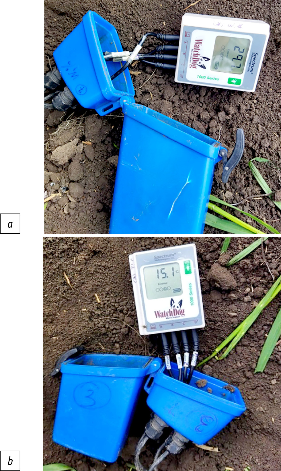 Рис. 1. Регистраторы метеостанции в полевых условиях, фиксирующие динамику: а — влажности почвы; b — температуры почвы.