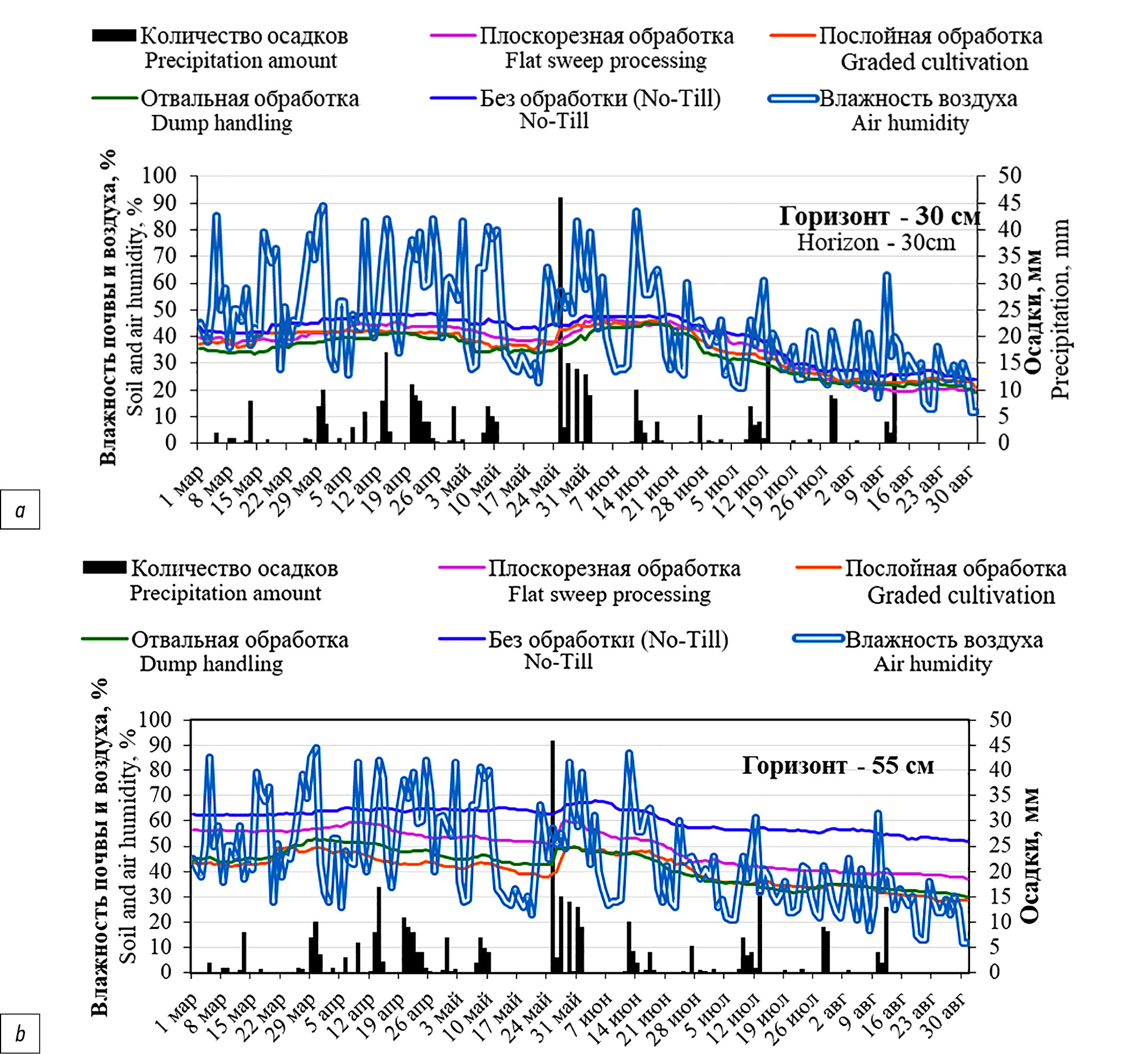 Рис. 3. Динамика влажности в почвенном горизонте на глубине 30 см и 55 см в зависимости от способа её обработки: a — в горизонте на глубине 30 см; b — в горизонте на глубине 55 см.
