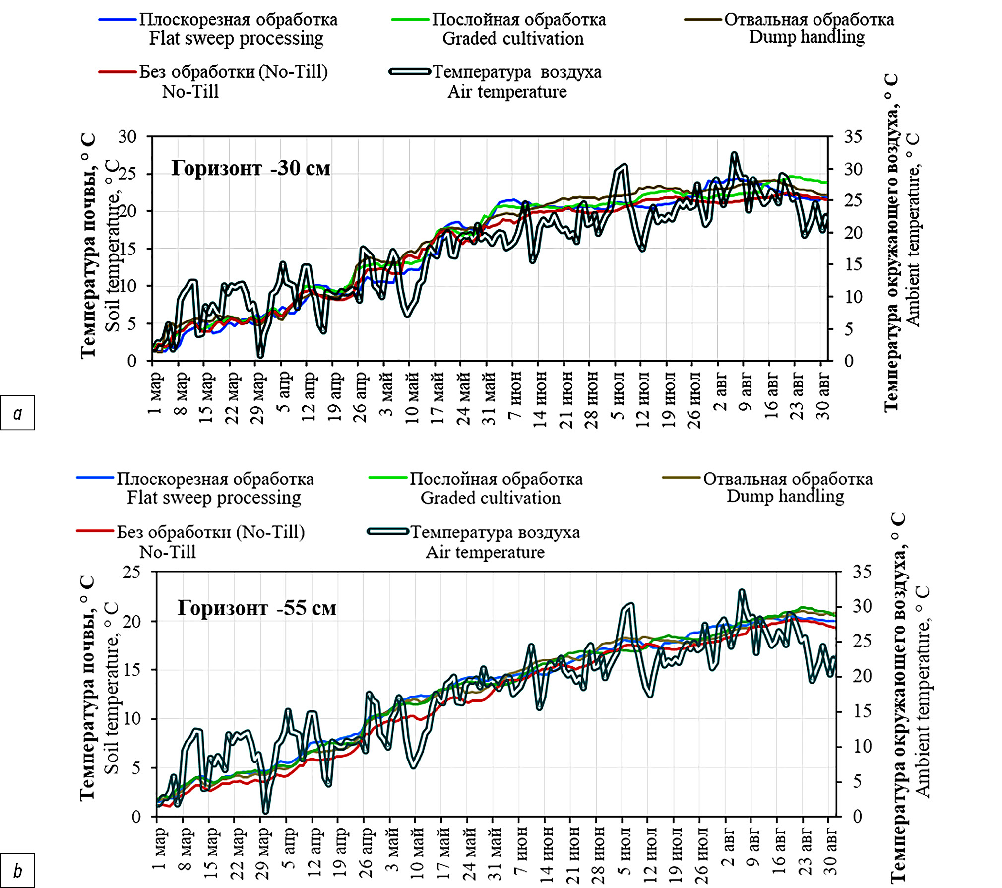 В результате анализа расчётных данных по температуре почвы (см. табл. 5 и 6) выявили ee высокую изменчивость на всех сравниваемых вариантах с плоскорезной, послойной и отвальной обработках и без обработки почвы (No Till), поскольку коэффициент вариации для глубины 30 см находится в пределах 44,22–47,23%; для глубины 55 см в пределах 42,27–50,34%.