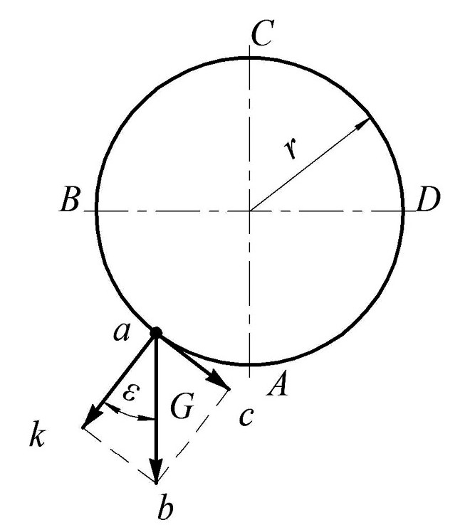Рассмотрим поведение частицы сухого компонента в рабочей зоне шнека и определим его конструктивные параметры. Условно допустим, что масса компонента, которая вновь поступает в рабочую зону шнека, выполняет функции крышки кожуха шнека и проследим поведение частицы массой m. Будем полагать, что частица массой m в данный момент времени занимает положение под углом ε по отношению к вертикальной плоскости CА (рис. 2). Разложим силу тяжести G частицы на две составляющие [1]: по радиусу шнека и касательной к нему.