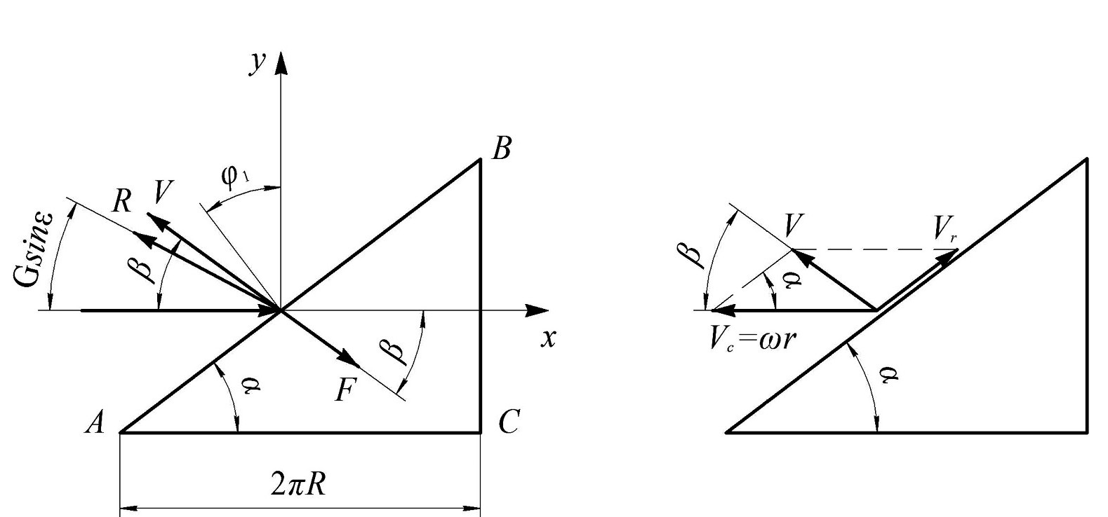 Развернув на плоскости винтовую линию и поверхность кожуха (рис. 3), рассмотрим схему сил, действующих на винтовую линию шнека и поверхность кожуха, и векторов скоростей.
