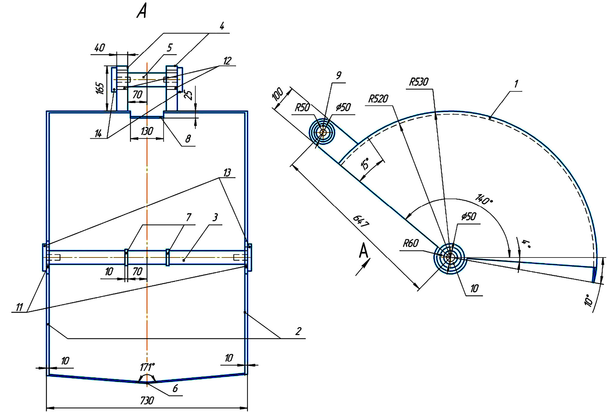 Рассматриваемая конструкция ковша, как и стандартный ковш, включает в себя: заднюю стенку 1, боковые стенки 2, оси 3 и 5, проушины 4, зуб 6 и отверстия 9 и 10 для осей. Однако задняя стенка 1 выполнена цилиндрической формы с возможностью её поворота вокруг своей оси 3. При этом зачерпываемый грунт заходит в ковш по касательной, ему препятствуют только силы трения на стенках [4]. При копании стандартным ковшом помимо сил трения неизбежно присутствуют нормальные сопротивления [5]. Конструкция предлагаемого ковша была дополнена дополнительными элементами с возможностью установки на экскаватор и реализации рассматриваемой механики копания. Например, паз 8 создан для беспрепятственного поворота ковша вокруг своей оси. При выдвижении штока гидроцилиндра он заходит в паз и не упирается в заднюю стенку 1. Бортики 7 выполнены для исключения продольных перемещений ковша в проушине рукояти экскаватора. Антифрикционные втулки 11 и 12 выполнены с возможностью поворота осей 3 и 5 в отверстиях 10 и 9 соответственно. Для исключения продольных перемещений осей 3 и 5 в них через резьбовые соединения вкручиваются заглушки 13 и 14 соответственно. Для большей прочности конструкции зуб 6 выполнен в единственном количестве с тупым углом заострения.