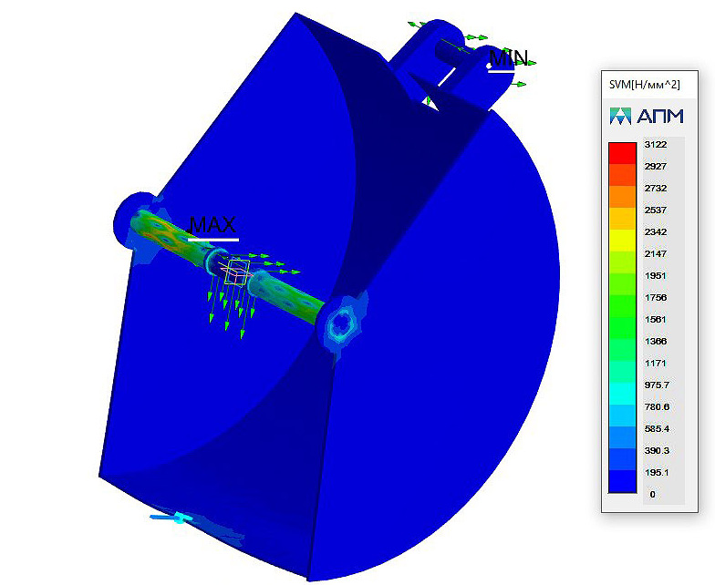 CONCLUSION: As a result of the study, changes in the design of the production bucket, which make it possible to install buckets of increased volume on an excavator without losing the strength and reliability of the structure, were proposed. The strength calculation showed a safety factor of 3.3, which proves the operability of the designed structure of the proposed bucket.