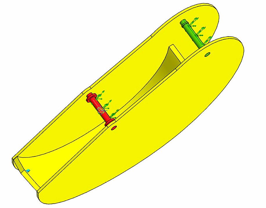 Анализ наиболее нагруженных мест модели показал, какие размеры деталей следует изменить. Для разгрузки оси 3 требуется сократить её длину, как следствие ширину ковша. В этом случае для сохранения объёма ковша придётся увеличить радиус стенки 1 и ширину стенок 2. Для снижения напряжений на зубе 6 следует увеличить толщину стенки 1. Проушины 4 также являются концентраторами напряжений, поэтому решено исключить их. Крепление оси 5 следует осуществлять на стенках 2. Во избежание трения штока гидроцилиндра о стенки 2, на оси 5 следует предусмотреть съёмные бортики, закрепляемые на оси 5 с помощью болтовых соединений. Для снижения напряжений в местах крепления осей 3 и 5 к стенкам 2 следует сместить крепления дальше от краёв стенок 2. Паз 8 существенно снижал прочность конструкции, поэтому было решено исключить его. Однако паз 8 исключал соприкосновение штока гидроцилиндра со стенкой 1 в процессе поворота ковша. Для сохранения функции беспрепятственного поворота ковша следует сместить крепление оси 5 как можно дальше от стенки 1, для этого необходимо увеличить ширину стенок 2.