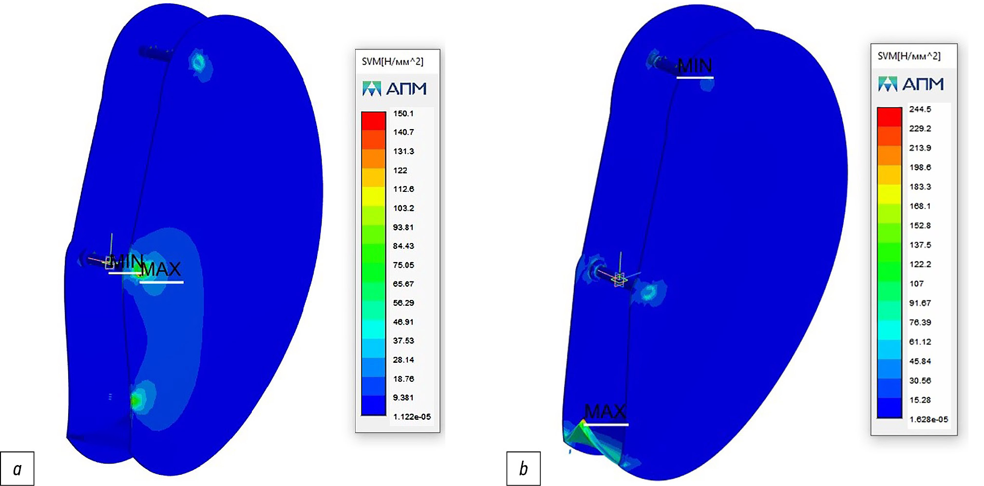 Fig. 6. Results of strength calculations of the refined design of the proposed bucket: а — force at the wall 2; b — force at the tooth 6.
