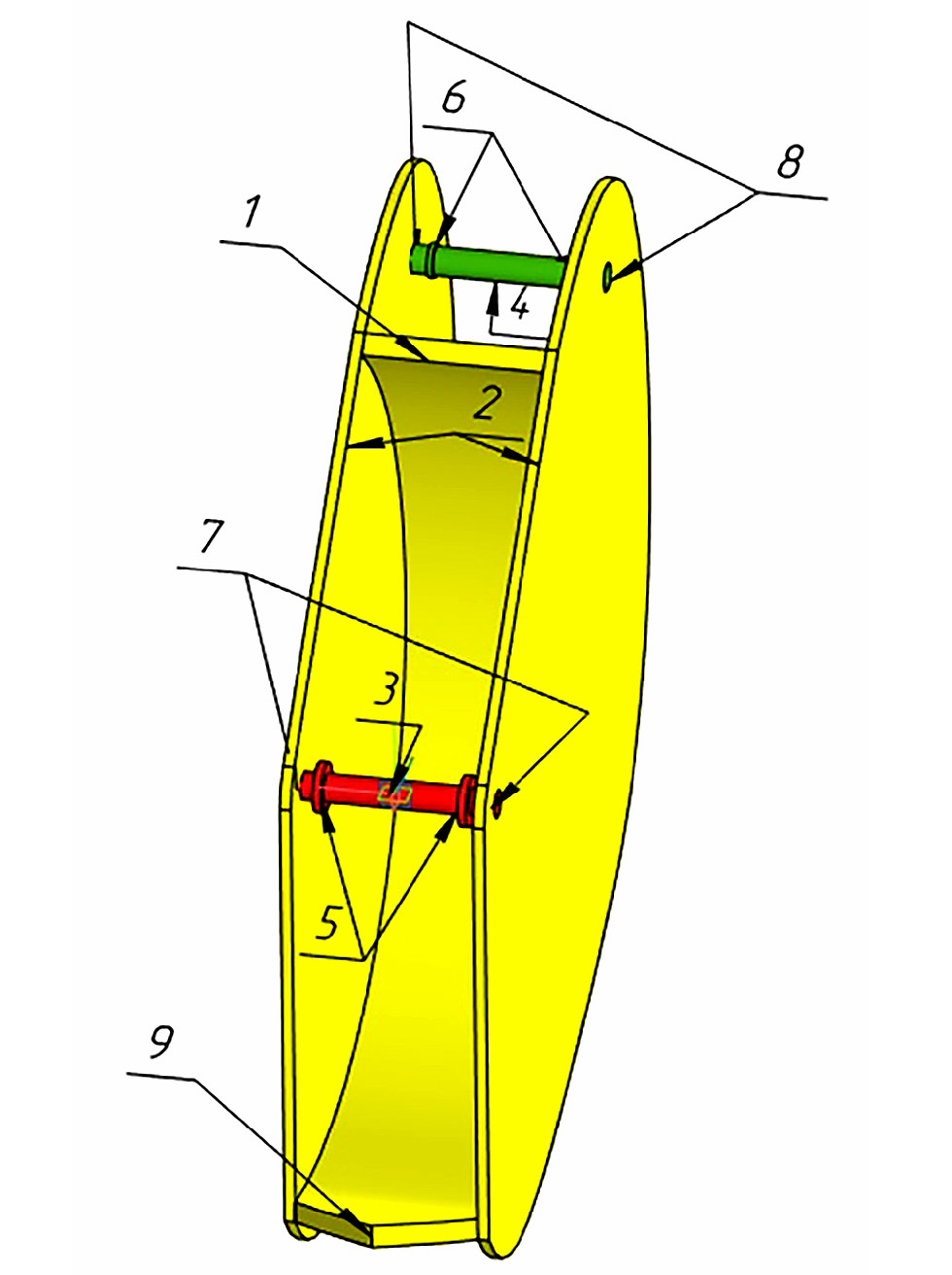 Fig. 1. A cylindrical bucket: 1 — a cylindrical frame; 2 — sidewalls; 3 — a bucket rotation axle for assembly with a dipperstick; 4 — a mount axle of a hydraulic cylinder rod for bucket rotation; 5, 6 — fillets for limiting longitudinal displacement of the bucket; 7— holes in the sidewalls for the bucket rotation axle mounting; 8 — holes in the sidewalls for mounting of the hydraulic cylinder rod mount axle; 9 — a bucket’s tooth.