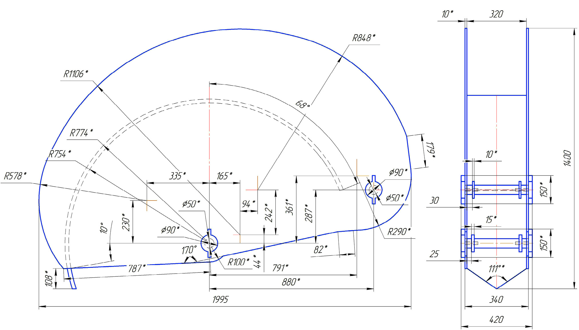 Одноковшовые гидравлические экскаваторы являются одними из самых востребованных машин в сфере строительства, добычи полезных ископаемых, в коммунальном и сельском хозяйстве. Затраты на покупку данных машин очень высоки и во многом зависят от конструкции и перемещения требуемого полезного объёма грунта. Как правило, увеличение требуемого полезного объёма перемещаемого грунта ведёт к удорожанию конструкции путём установки на машину более мощного двигателя, который обеспечит работу более мощного гидропривода. Установка более мощного гидропривода и двигателя связана с тем, что с ростом рабочего объёма ковша увеличивается площадь контакта ковша с грунтом. Таким образом, возрастают силы сопротивления на ковше, которые требуется преодолеть гидроприводу. В работе будет рассмотрена конструкция цилиндрического ковша, которая позволяет за счёт изменённой формы и траектории движения снизить силы сопротивления копанию (рис. 1) [1–2].
